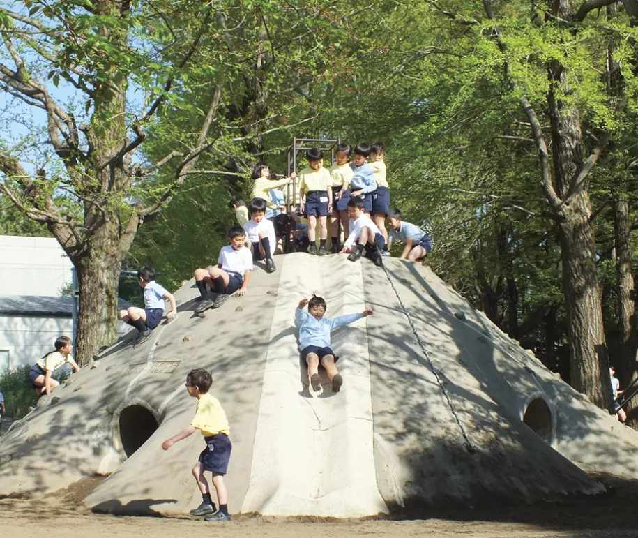 子どもたちが大好きなトンネル山には、滑り台のほか、鎖や石の突起があり、下の方には、四方へ抜けられる通路も設けられています。登る、降りる、くぐる——。子どもたちはそれぞれの発想で遊びを広げてきました。設置から60年。世代を超えて親しまれてきたこの象徴的な遊具は、現在、老朽化のため使用を休止しています。安全面の確認と修理方法を慎重に検討しながら、再び子どもたちを迎えられる日を待っています。