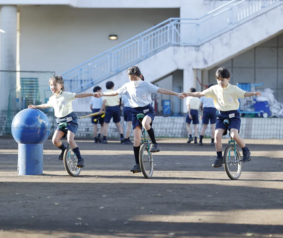 サッカーや野球はもちろん、一輪車や鉄棒など、子どもたちはさまざまな遊びを楽しんでいます。200メートルトラックが取れるほどの広さがあり、毎年の運動会もここで開催されます。そして、グラウンドの一角には、小学校には珍しい屋根付きの土俵が!大相撲の土俵よりもやや小ぶりですが、体育の授業や集会活動など、様々な場面で子どもたちが組み合って力を試し合う姿が見られます。