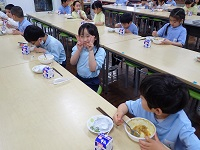 友達同士の間隔を広げ、密集しないようにして食べる初めての給食で、牛乳パックにストローをさすのに手間取る児童もいましたが、どの児童も食欲旺盛で、あっという間に食べ終わっていました。