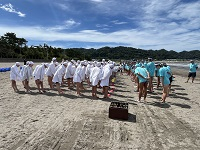 水泳訓練最終日です。師範の指導のもと、のんびりと訓練することができました。本日は、浜でのスイカ割りも楽しみました。なかなかスイカが割れない班などさまざまでしたが、笑顔いっぱいの子どもたちでした。最後に、師範への感謝、海への感謝をして水泳訓練を締めくくりました。