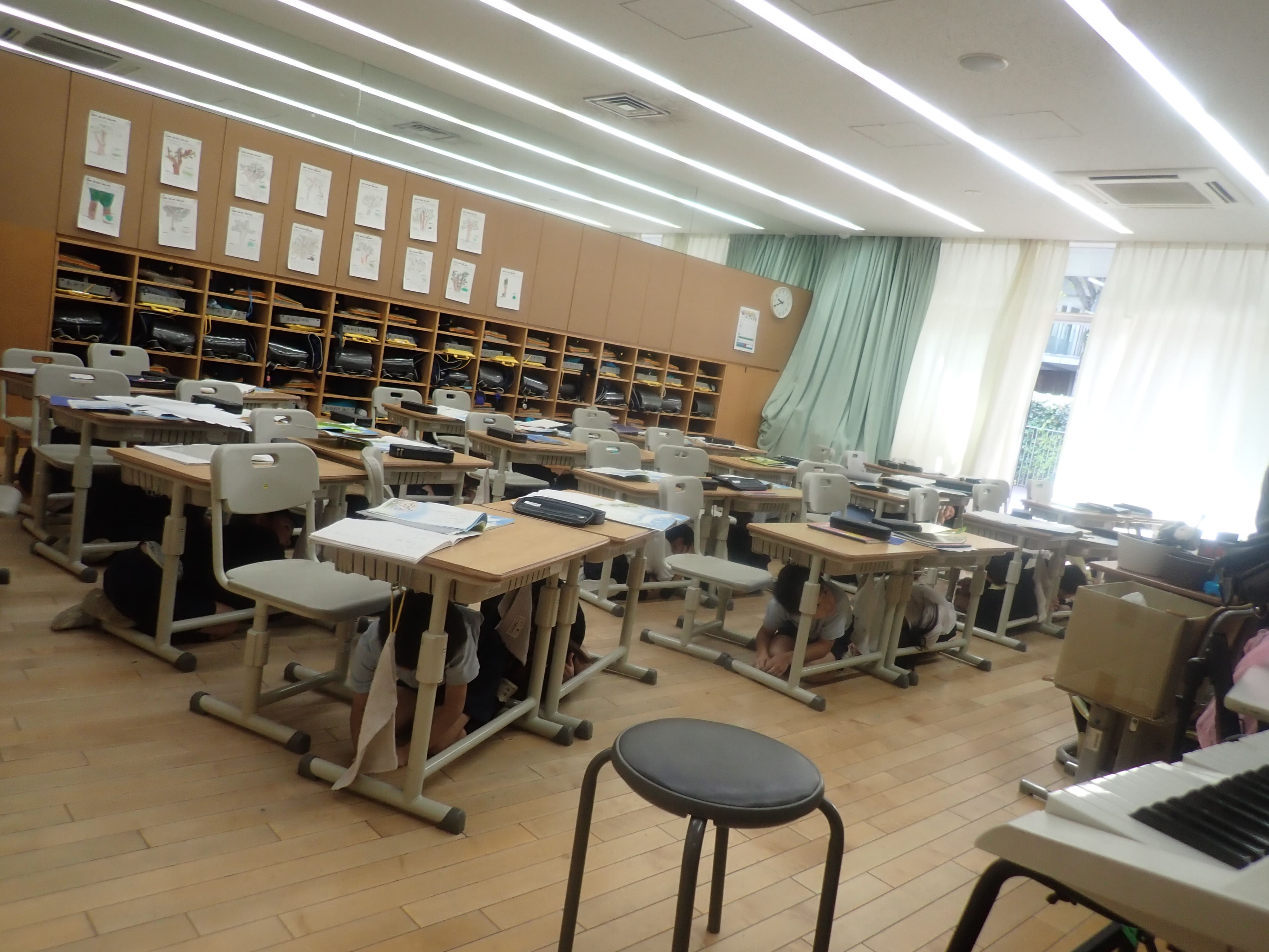 緊急地震速報が放送で流れると、教室にいた児童は素早く机の下に潜り、頭を護っていました。