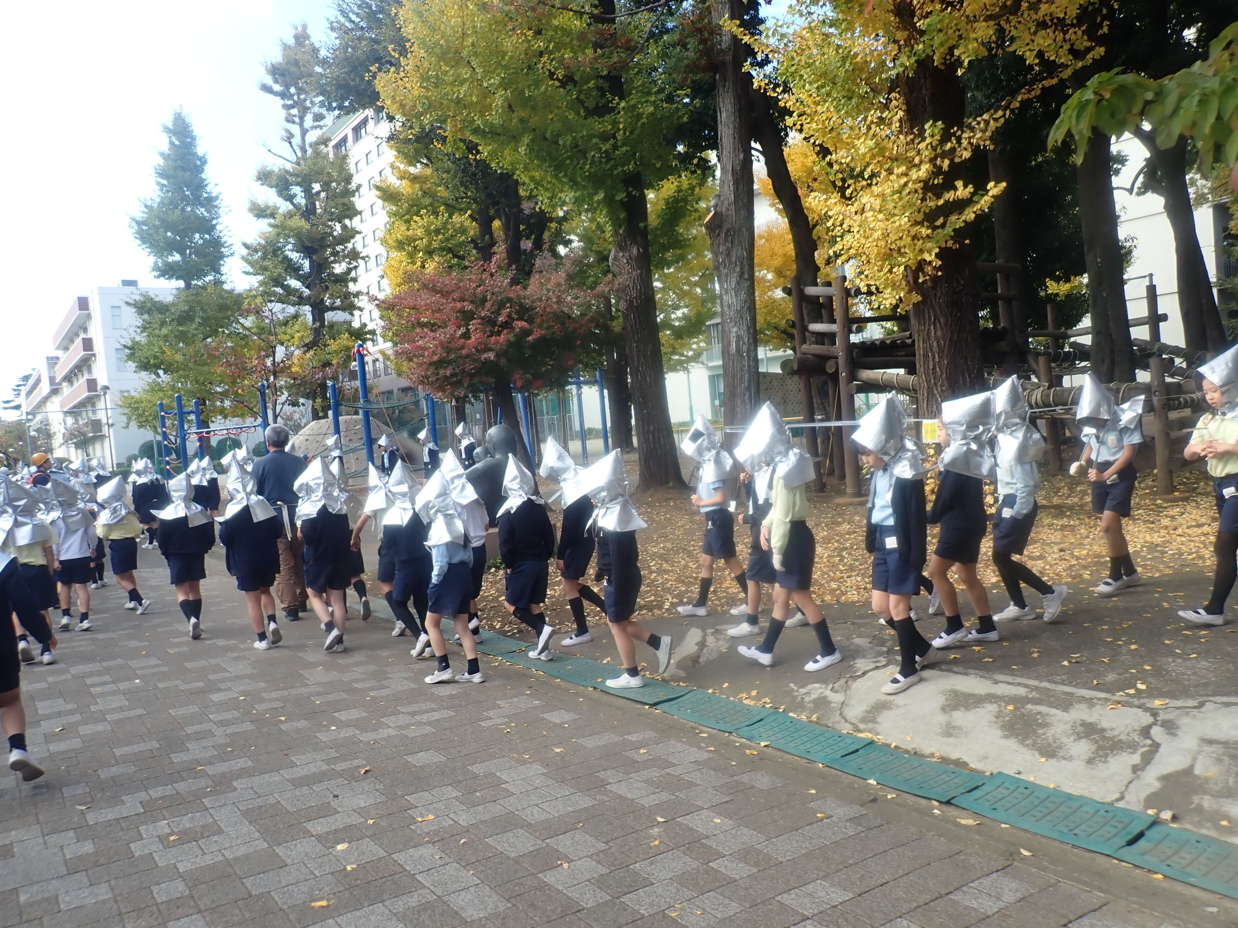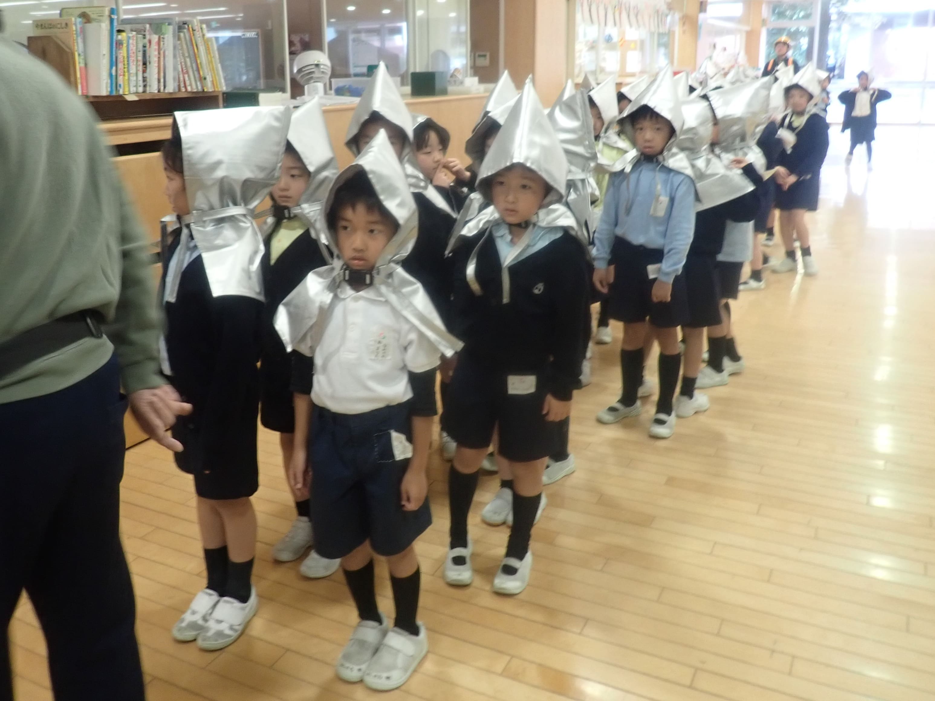 その後、担任や専科の先生の指示のもと、各自で防災頭巾を被り、素早く廊下に整列して、速やかに行動していました。