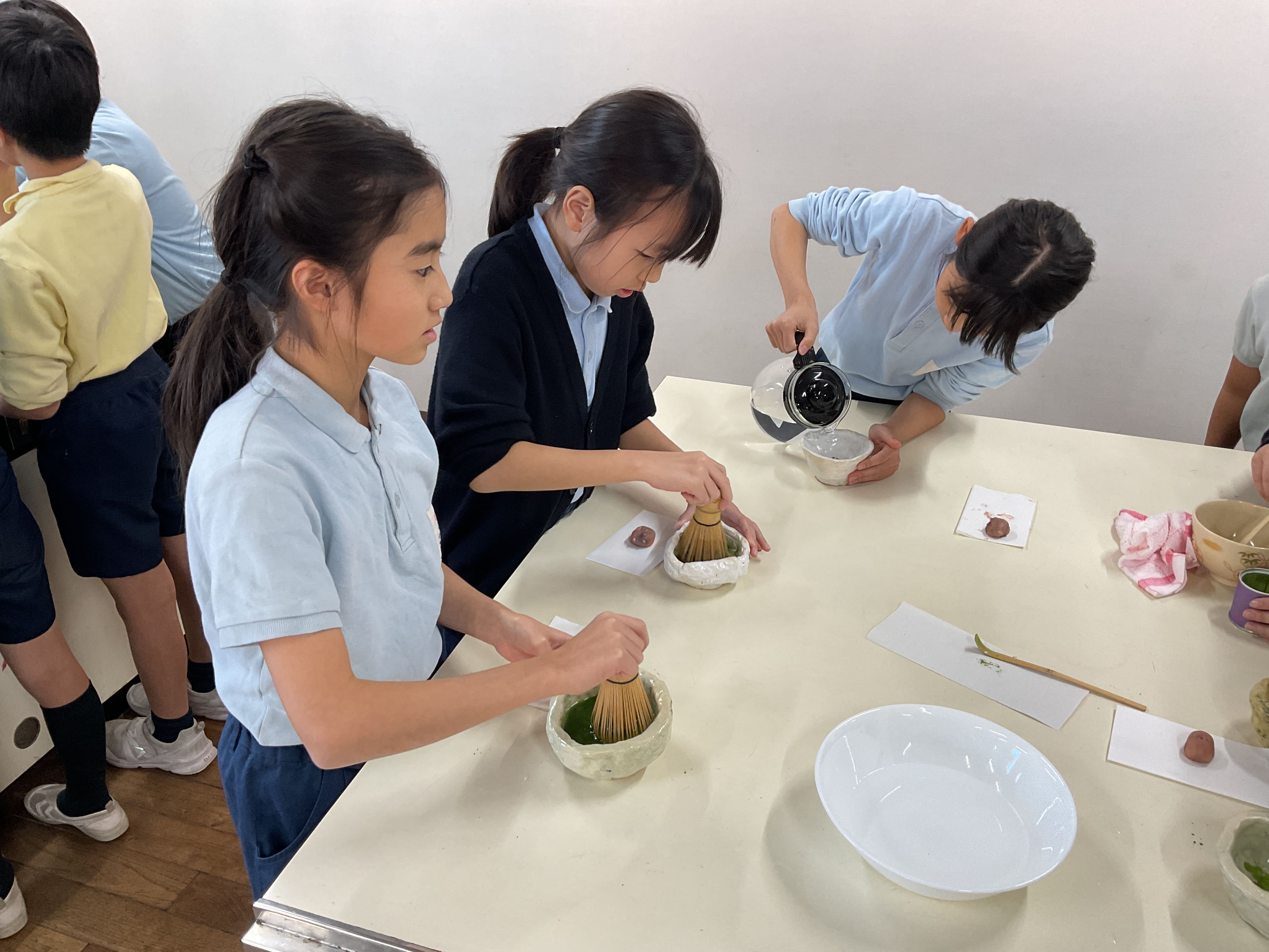 茶碗を手に取り、初めて自分でお茶を点てる体験に、子どもたちは大きな喜びを感じていました。茶道の「おもてなしの心」に触れながら、丁寧に茶筅を動かす姿はとても真剣です。