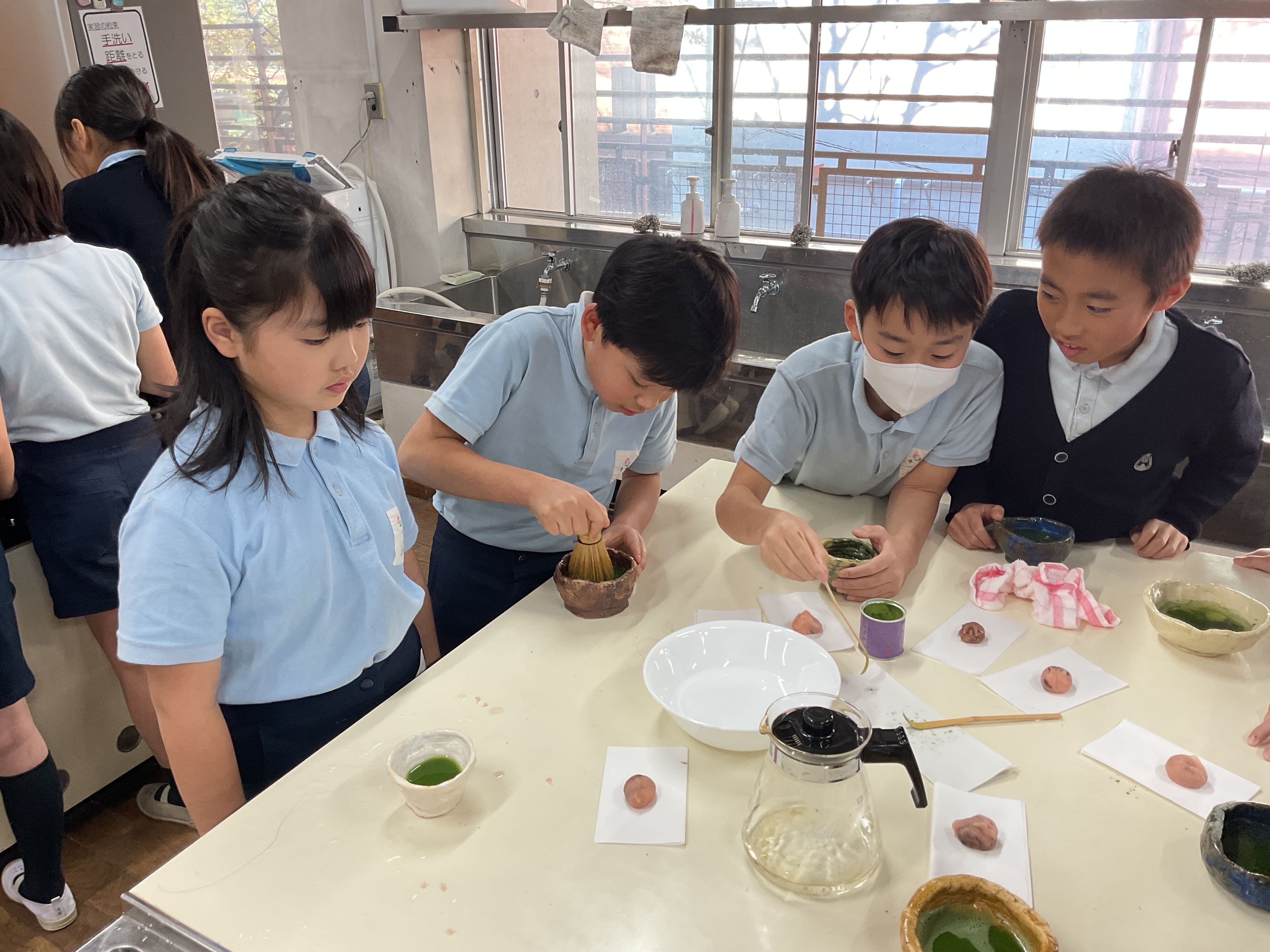 四年生が美術で自分たちが作り焼き上げた茶碗を使って、簡単なお茶会を開きました。