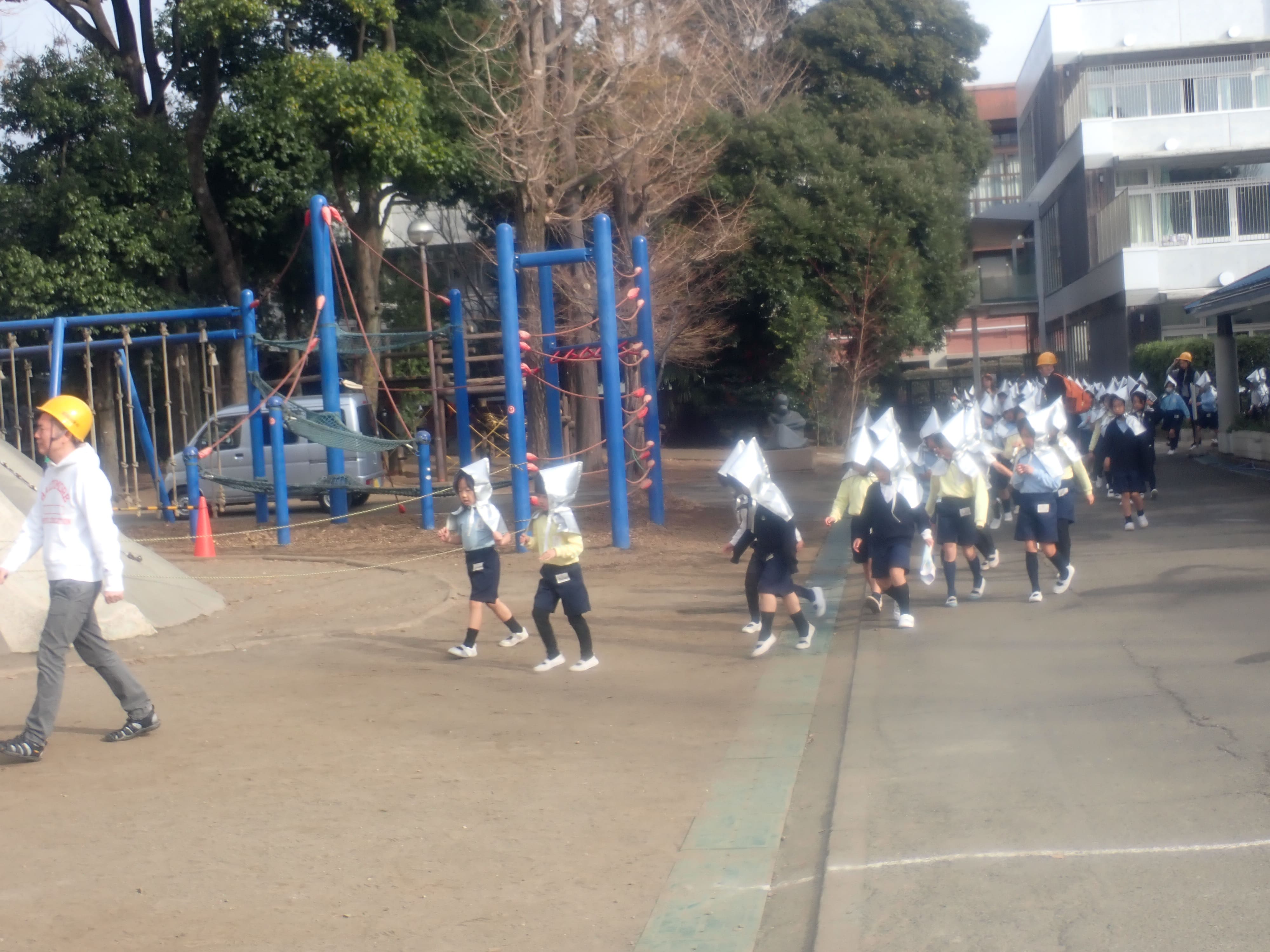 児童たちは、おしゃべりをせず、教員の指示に従い静かに、担任や専科の先生の指示のもと、各自で防災頭巾を被り、素早く廊下に整列して、ポプラグラウンドへ避難しました。今回は教員だけでなく消防署の職員の方にも避難の様子を確認していただき、児童たちは、過去3回の訓練同様、落ち着いて行動しており、有意義な訓練となりました。