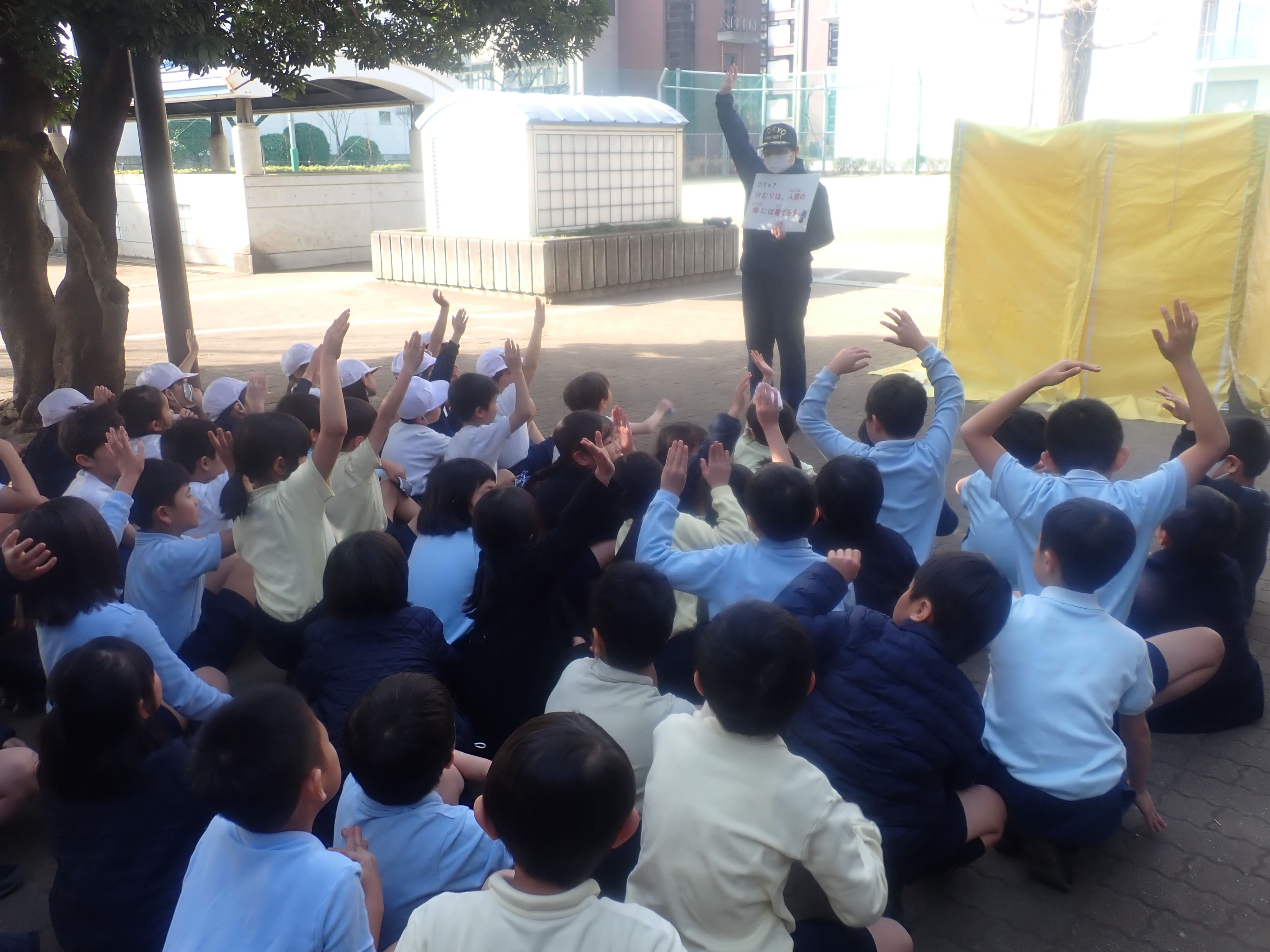 また、その後、2年生を対象に、実際にけむりの中の様子を体験する「けむり体験」を行い、実際に地震の後、火災等でけむりが発生した際の様子を疑似体験しました。消防署の職員の方から、煙と火事についての知識をクイズ形式で教わり、学校での訓練時のように外が明るくない場合の避難の仕方、煙が上がっていた時の避難姿勢についても教わり、実際にけむり体験をする児童は、右の壁を手で触れながらゆっくりと歩いてけむりの中を避難する訓練を行いました。