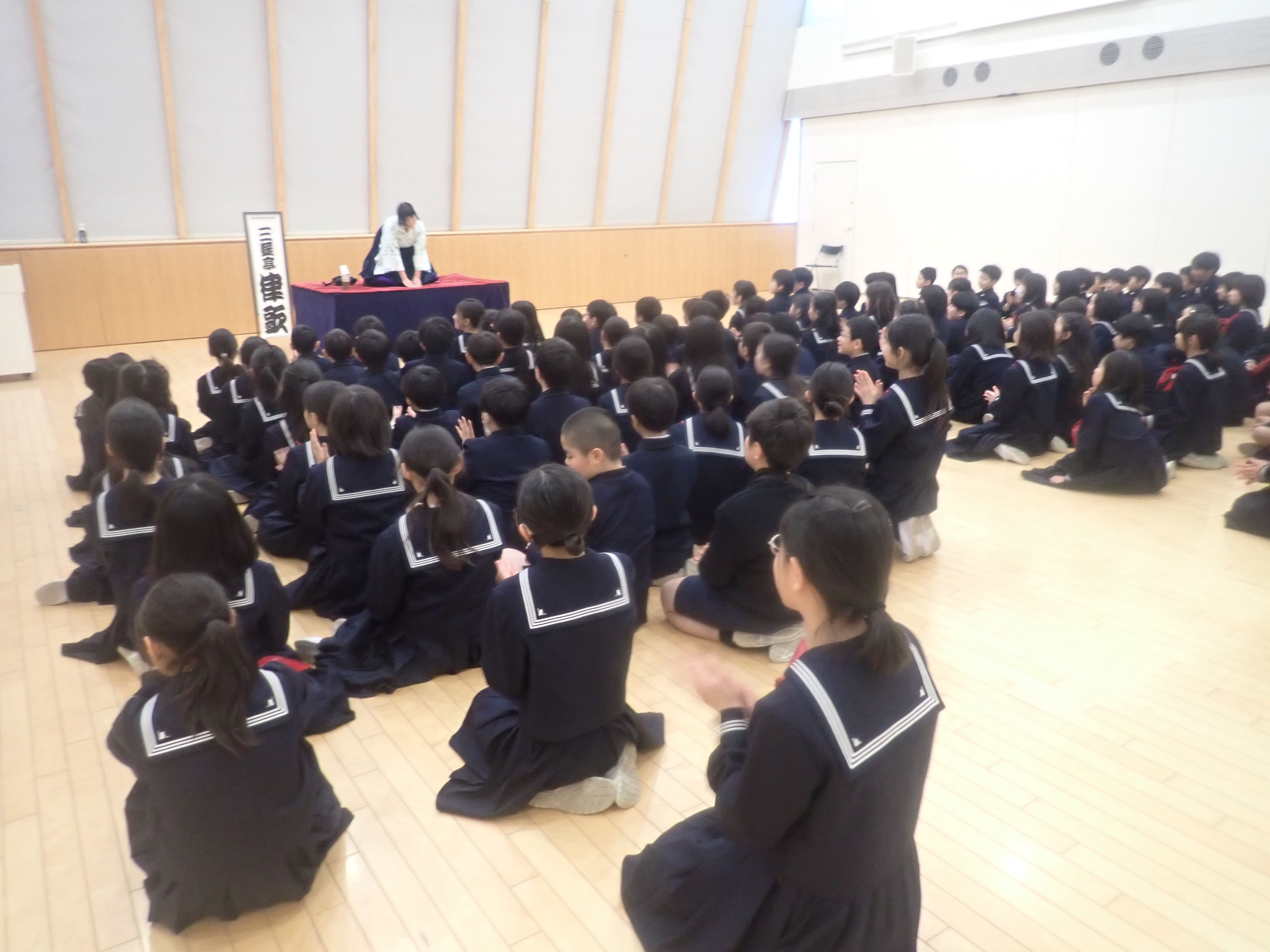 1月27日(火) 4年生対象の「落語鑑賞会」を、けやきホールにて開催しました。 4年生は、1学期に国語の授業で落語を、『ぞろぞろ』という教材で学習しています。テレビなどでも落語を観る機会はあります。とはいえ、間近で本物に接する機会は限られています。そこで子どもたちに、日本の伝統文芸である落語に、実際に触れてもらいたいという思いから、例年、プロの噺家に講演をお願いしています。