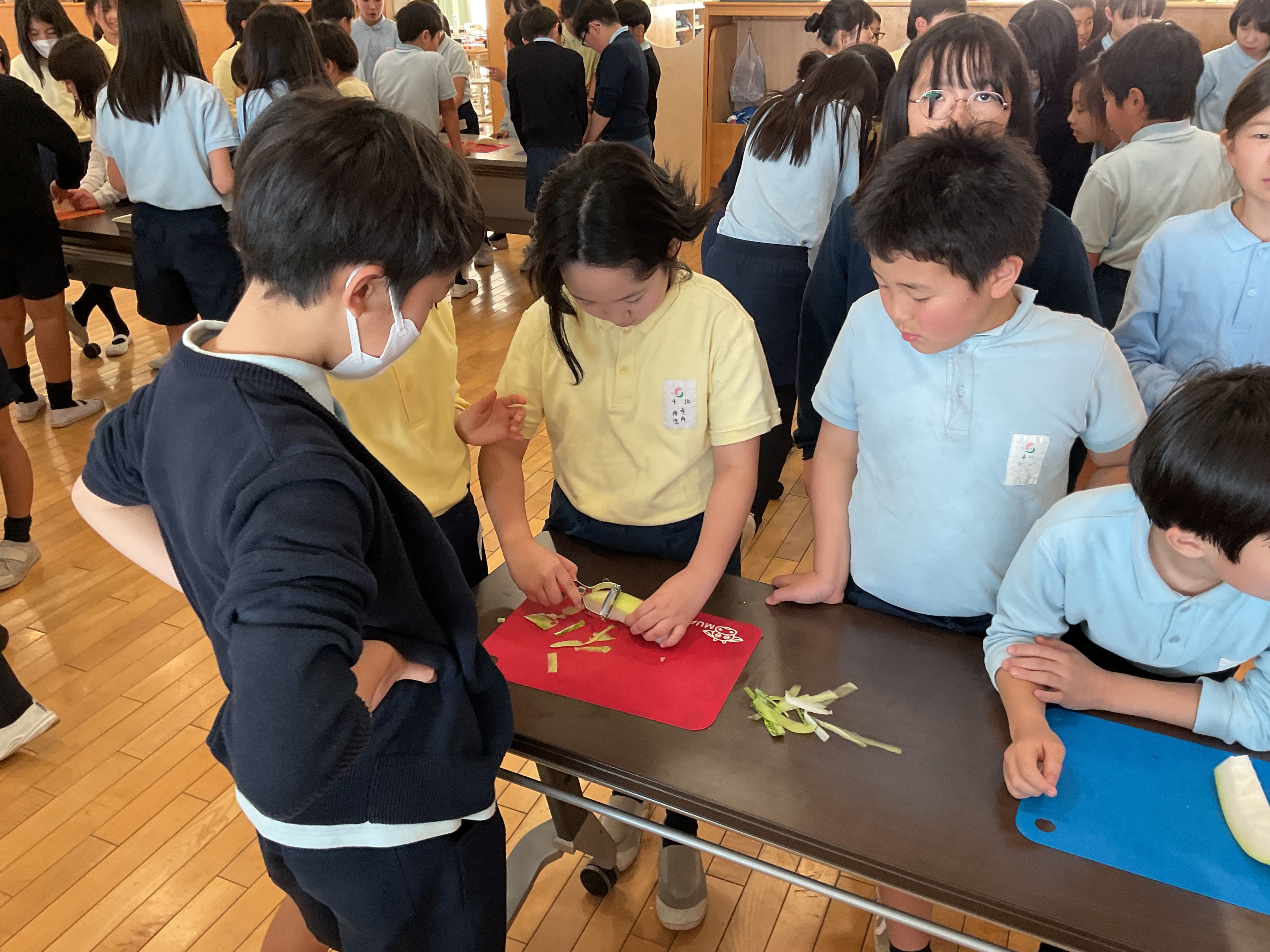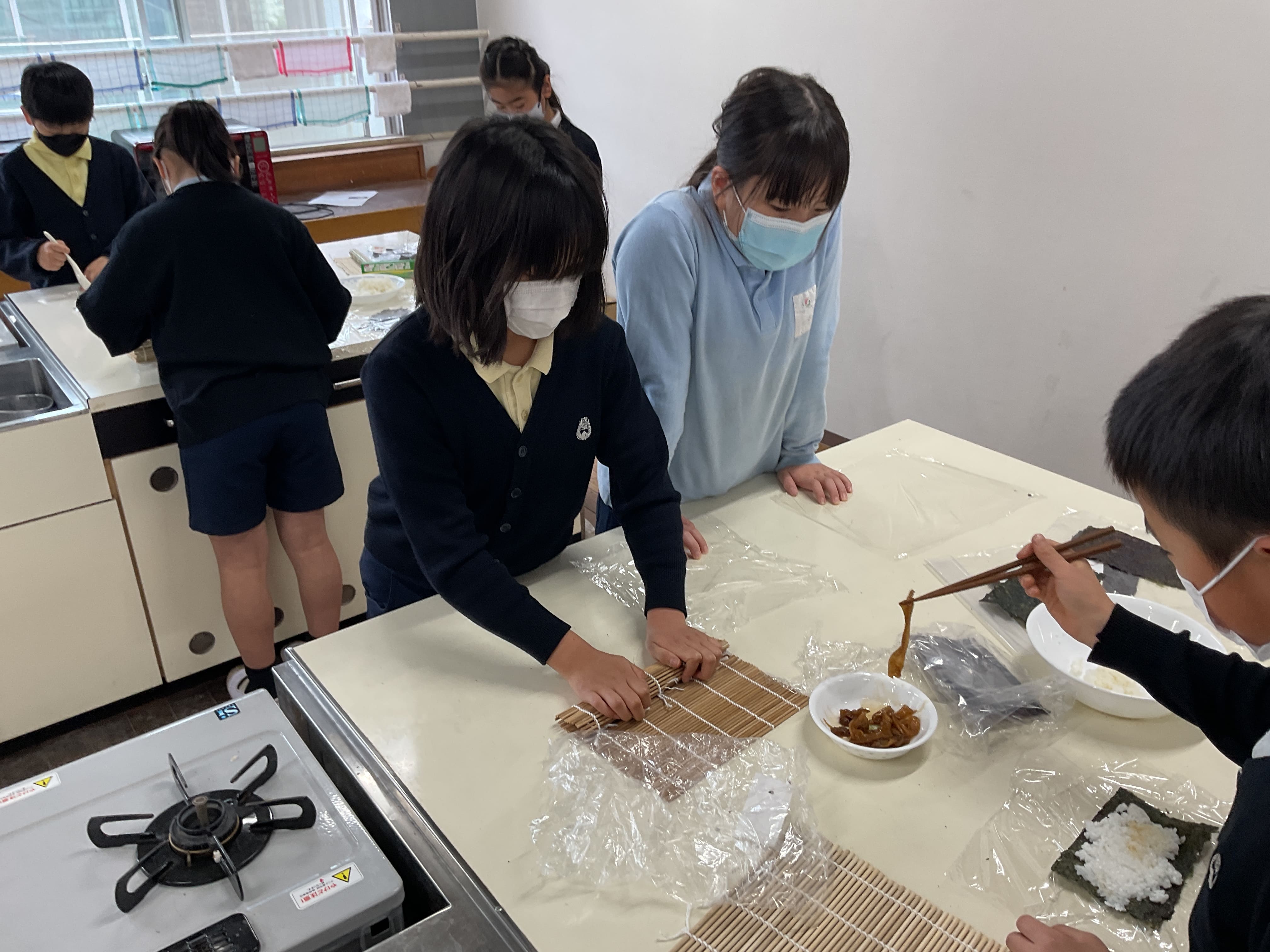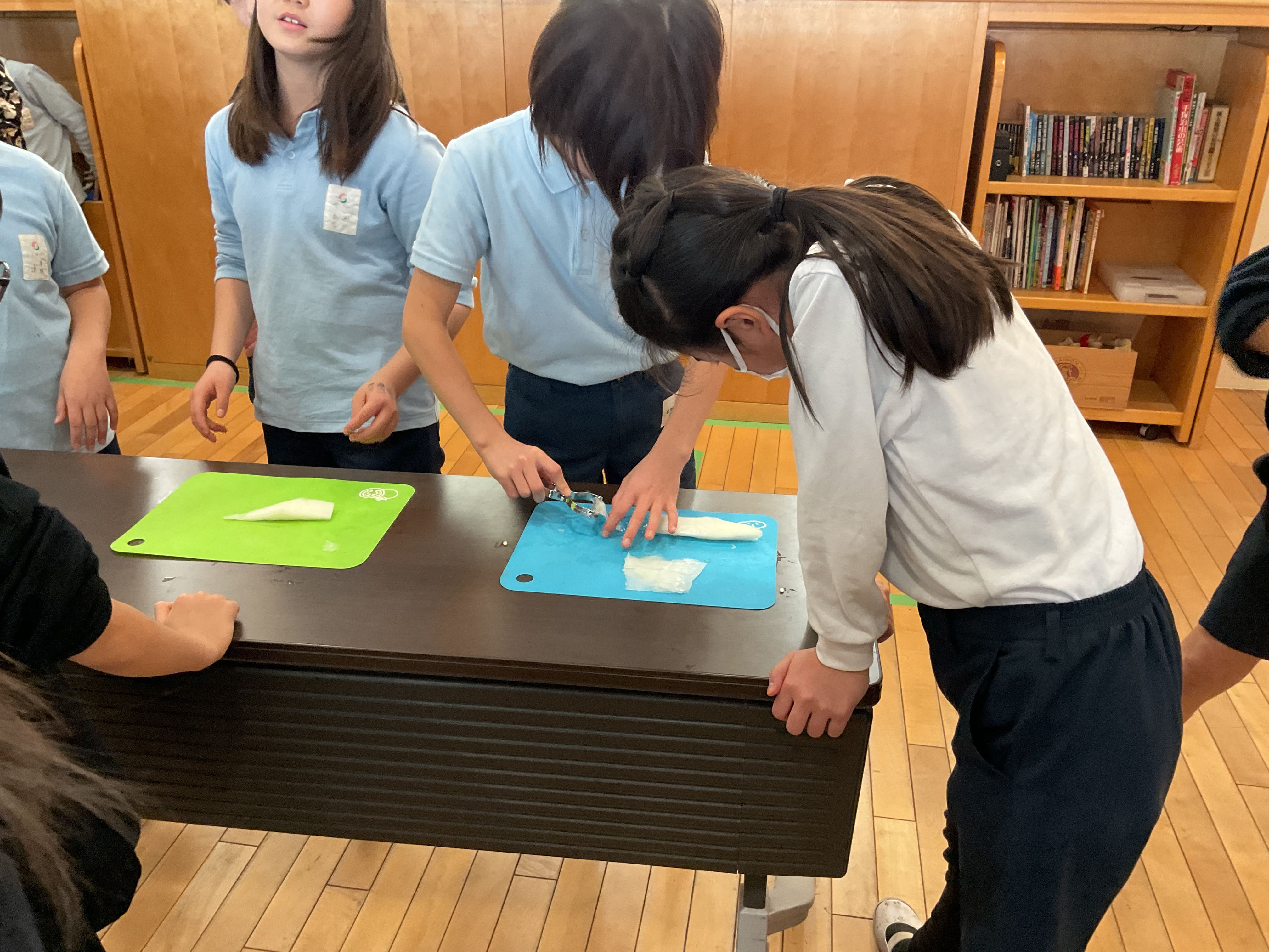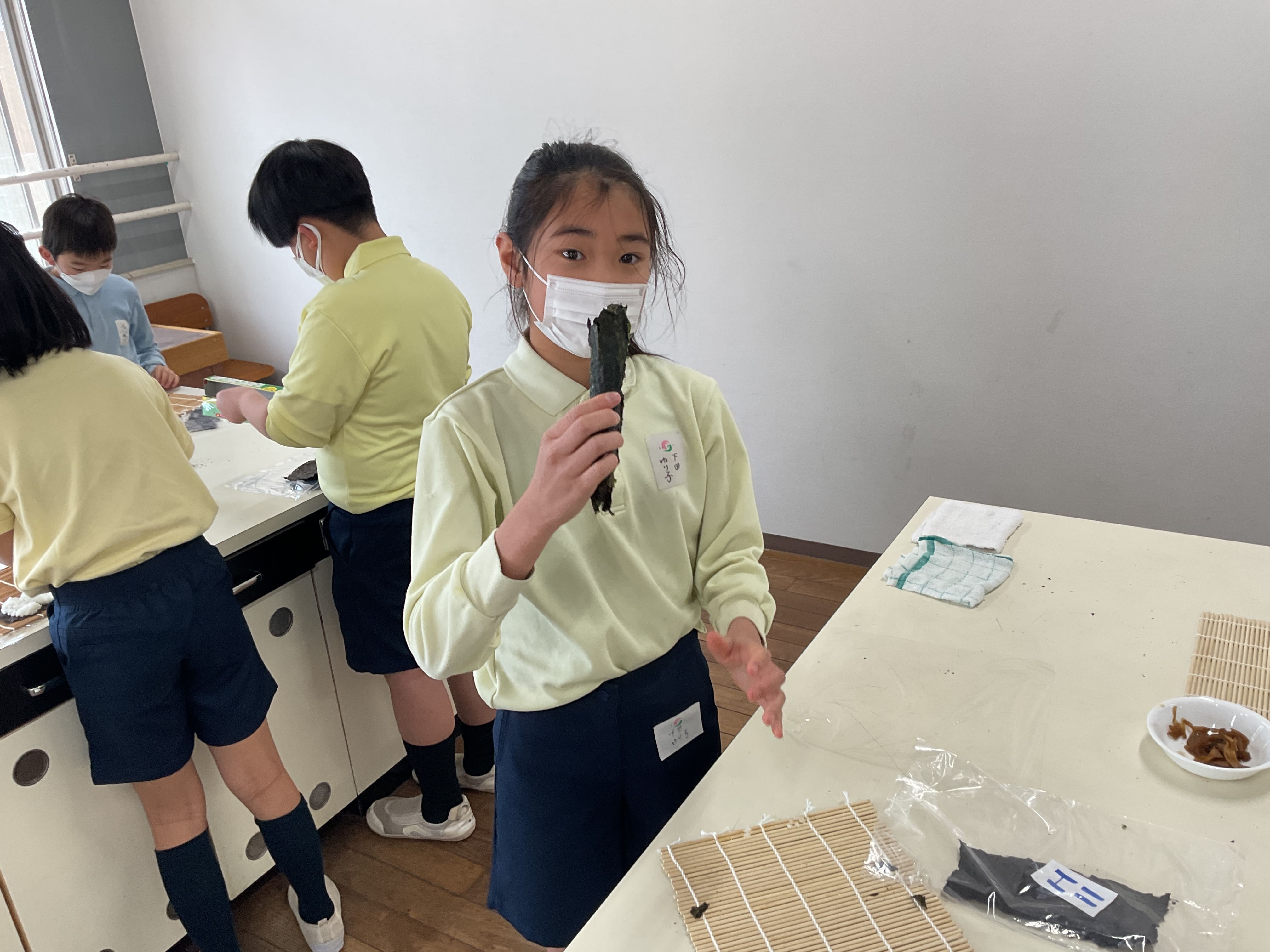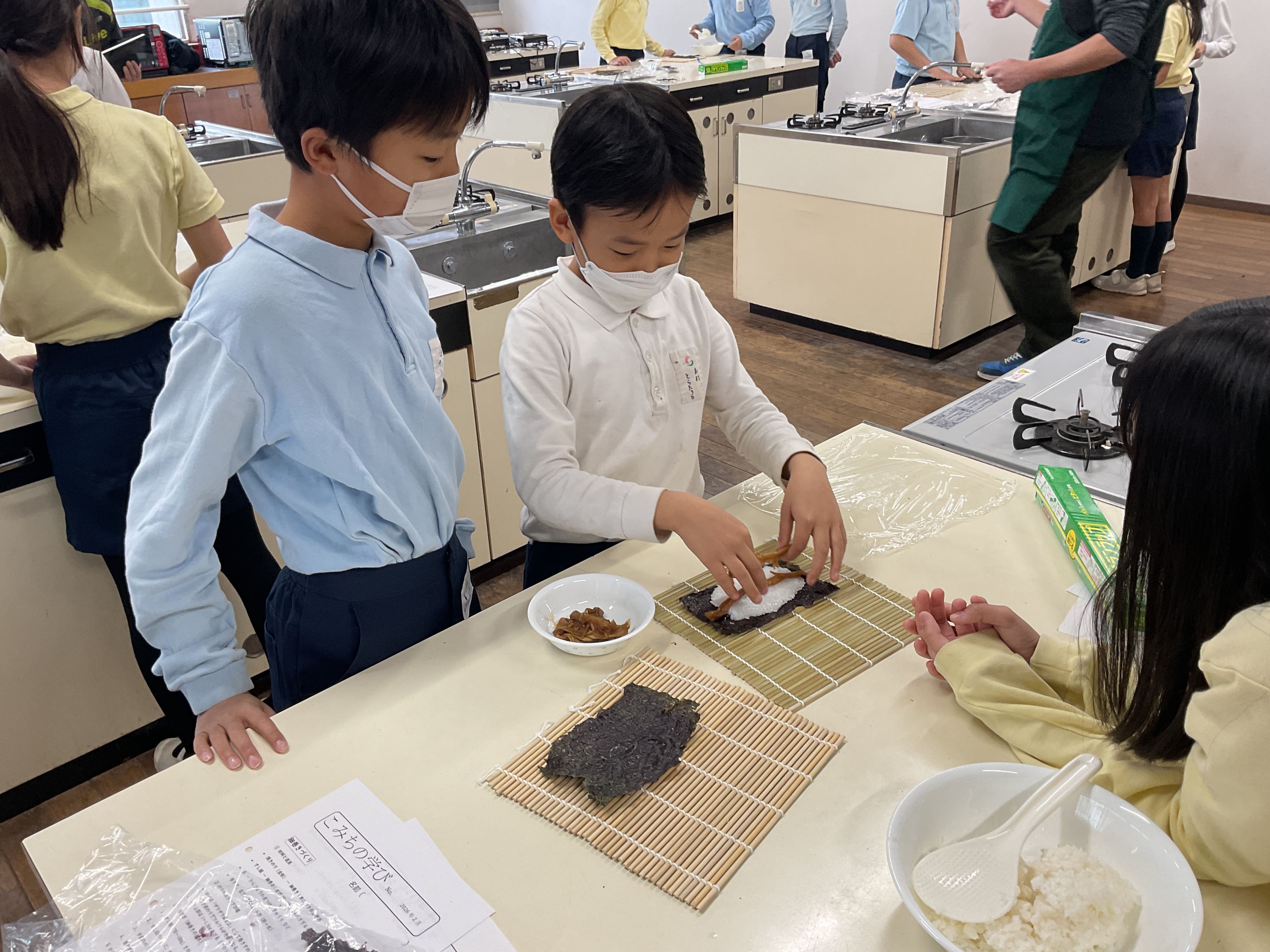 今回使用した海苔は、1月26日の社会科見学「大森 海苔のふるさと館」で、子どもたち一人ひとりが体験した海苔付けで作ったものです。また、かんぴょうも1月19日に学年全体で冬瓜を薄くスライスしたものと、干しかんぴょうを水で戻して煮つけたものを使いました。まさに、材料の段階から子どもたちが1から作ったといえる手づくりのかんぴょう巻きです。