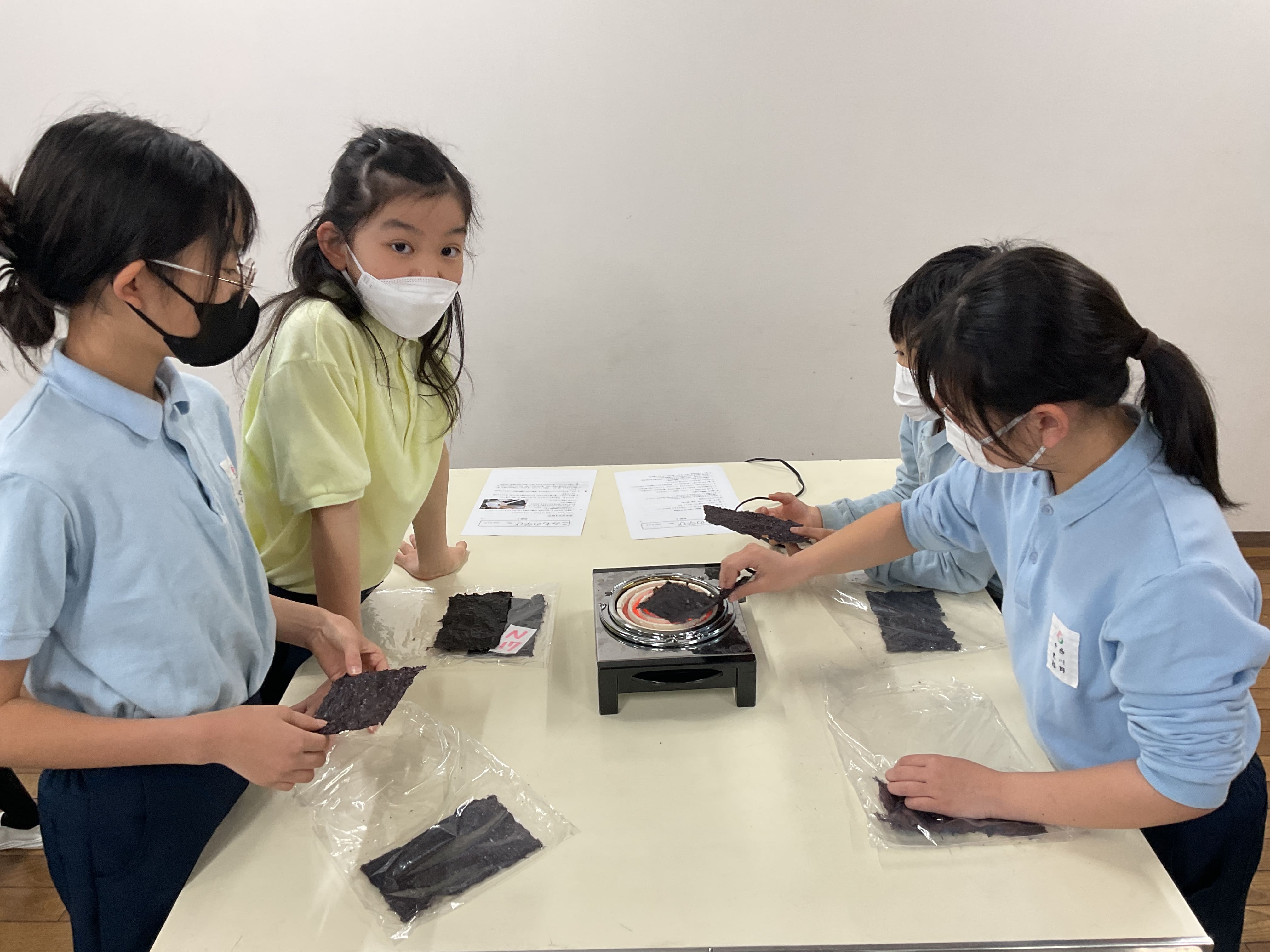 活動は、乾燥した状態の「乾海苔」を電熱器で「焼き海苔」にするところから始まりました。焼き上がった海苔に、酢飯と煮つけたかんぴょうをのせ、自分の手に巻いていきます。