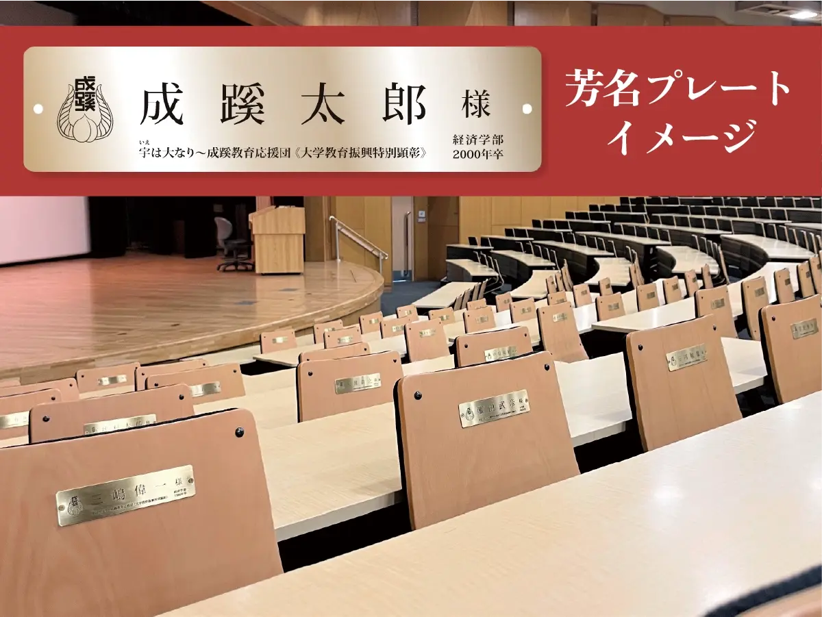 寄付先「4号館イス募金」へ一定額以上*ご寄付いただいた皆様のご芳名をプレートに刻み、大学4号館多目的ホールの座席に設置させていただきます。