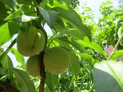 学園史料館前には、成蹊の名の由来となっている中国の諺「桃李不言下自成蹊」にちなんで、桃と李(すもも)の木が植えてあります。桃の実は日に日に大きくなり、李の実も赤く色づいてきました。