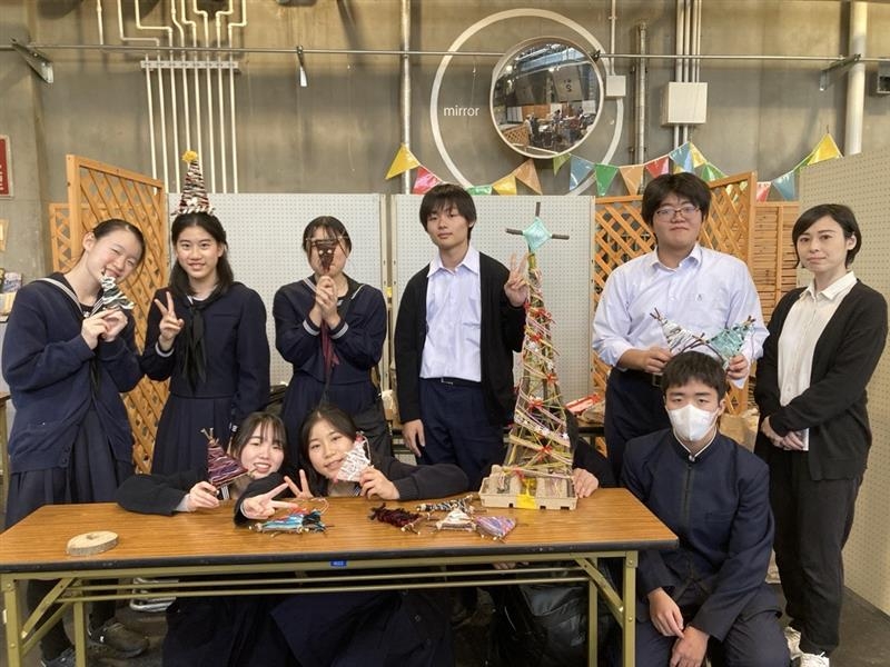 当日は中高ユネスコスクール探究プロジェクト※とのコラボで、ケヤキの枝と家庭で不要になった毛糸や布などを使ったクリスマスオーナメントづくりのワークショップを行いました。