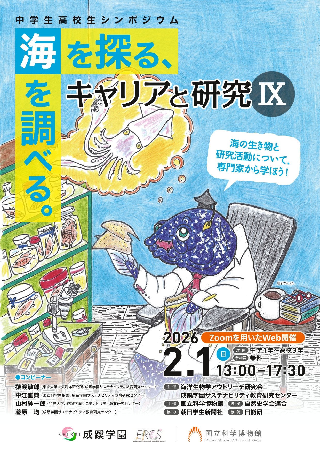 海洋生物学アウトリーチ研究会と成蹊学園サステナビリティ教育研究センターは2026年2月1日(日)に、全国の中高生を対象として、海の生物と研究活動を専門家から学ぶシンポジウム「海を探る、海を調べる。キャリアと研究Ⅸ」を開催します。