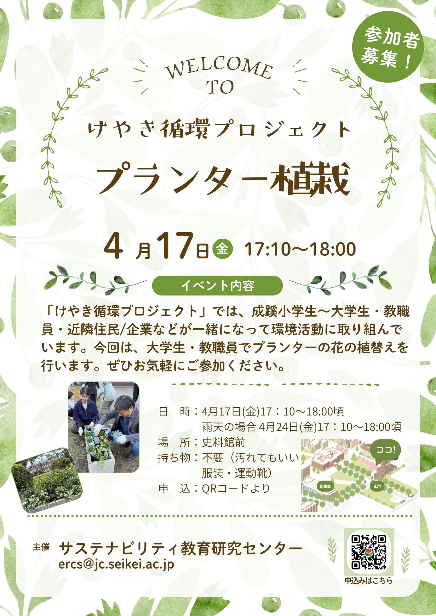 なお、6月以降に実施予定の「けやき循環プロジェクト」の活動(ケヤキの落ち葉集め、第2回プランターの花の植替え等)については、2026年度入学者を対象とした「成蹊一貫連携教育支援プログラム」(ICE)の活動に指定され、必要時間数の活動に参加すると単位認定されます。
