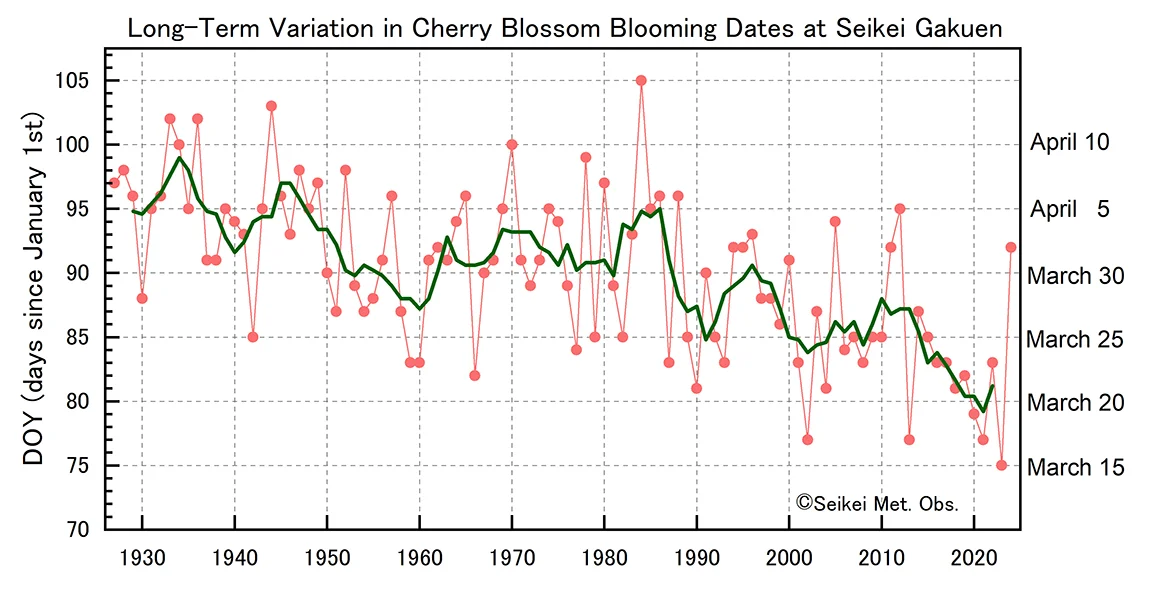 The following graph shows the long-term variation in the flowering dates of the Seikei cherry blossoms. The red circles represent the flowering date for each year, and the green solid line shows the five-year running means. The left vertical axis indicates the number of days elapsed since January 1, while the right vertical axis converts these values into calendar dates. Until the 1940s, the cherry blossoms typically flowered around April 5–10. Thereafter, flowering dates gradually shifted earlier, and by the 1980s it became common for them to bloom from late March to early April. Since the late 1980s, flowering dates have advanced rapidly, with the earliest on record occurring in 2023, when the blossoms opened on March 15. Compared to 100 years ago, this represents an advance of roughly two weeks. However, in the following year, 2024, the flowering date was delayed to April 1 despite a warm winter. This delay is attributed to the unusually low temperatures in March.