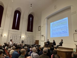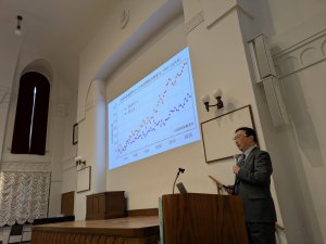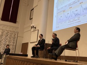 100年前から残る紙にペンで記録された気象観測データを、地震計の波形解析を応用してデジタル化する研究についてもお話しました。この研究は、講演会の司会を務めた成蹊大学経済学部教授の財城真寿美が進めているものです。