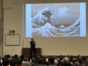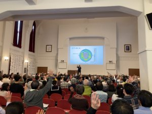 本館大講堂の舞台上を所狭しと動き回り、笑いを取りながら進める森田さんのお話に会場の全員が引き込まれて、会場はとても良い雰囲気となりました。