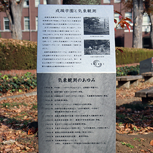 成蹊学園では1926年に正式な気象観測が始まりました。それから100年を迎えることを記念して建てられたものです。気象観測開始当初の観測地の近くに設置しました。モニュメントには、成蹊における気象観測のあゆみを記しています。