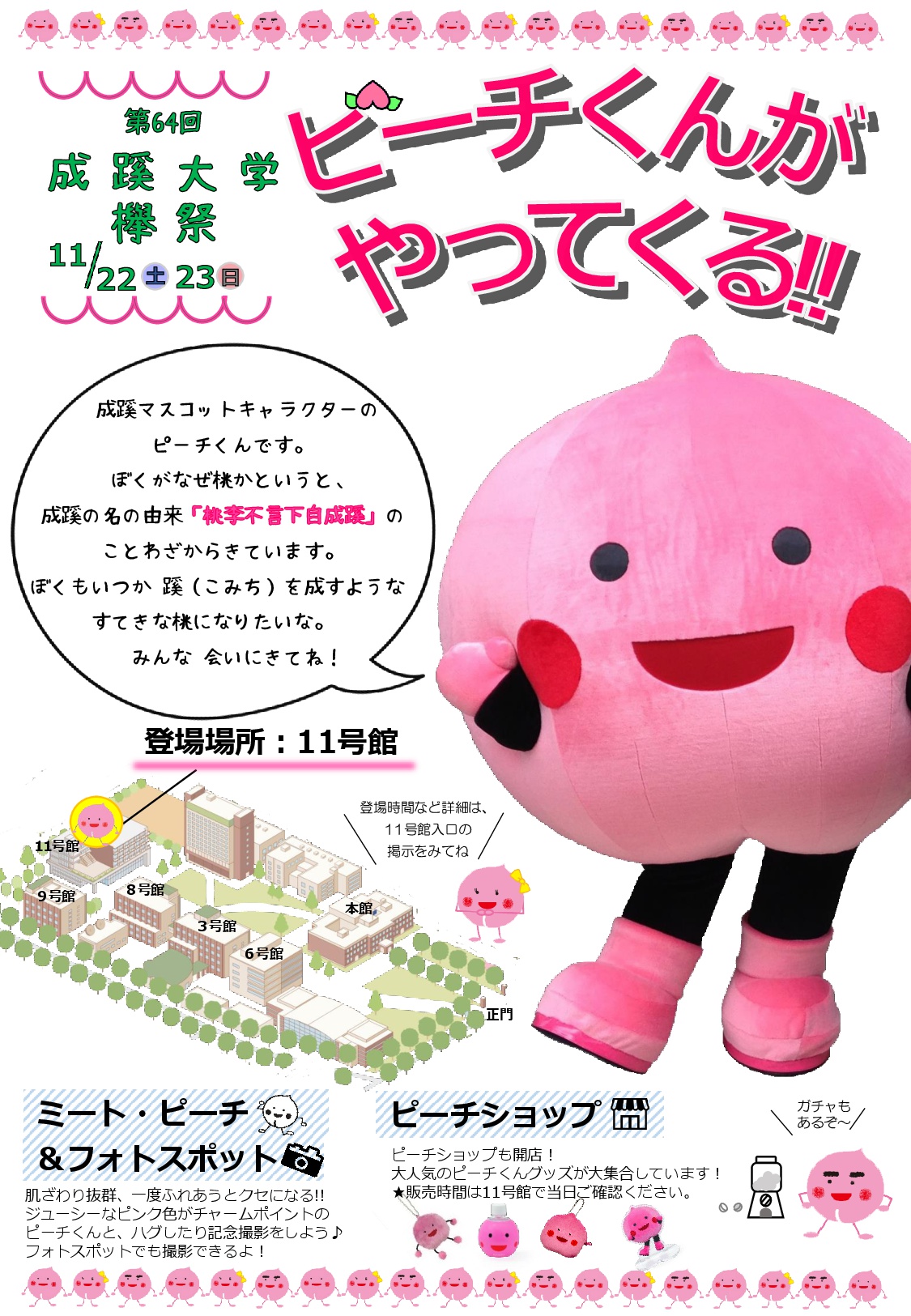 今年は新しくなった大学11号館での特別イベントを開催!ピーチくんと会える「ピーチくんとあそぼう」のほか、スタンプラリーやピーチくんのおへやの公開、オリジナルグッズの出張販売などを行います。