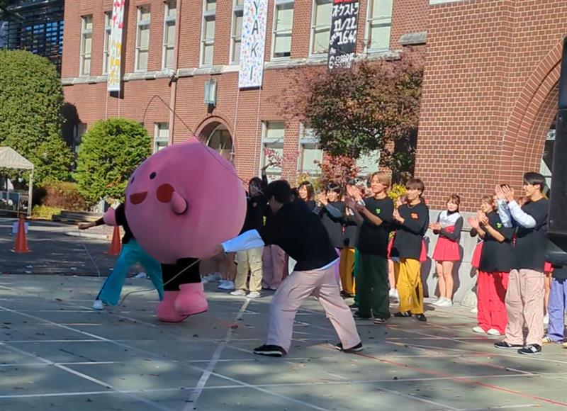 また、22日(土)に本館前で行われたオープニングでは、ダブルエイト×チアのコラボパフォーマンスにピーチくんもゲスト参加し、その華麗な跳躍で欅祭の始まりに華を添えたほか、今年は司会のお手伝いもしました。