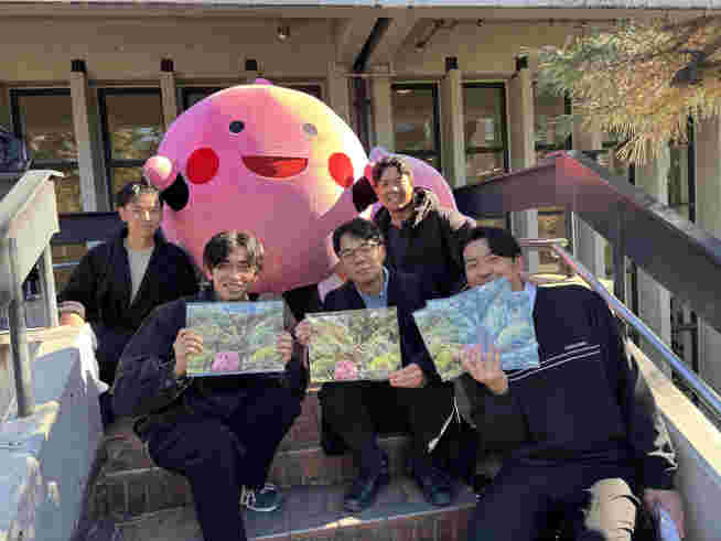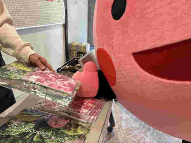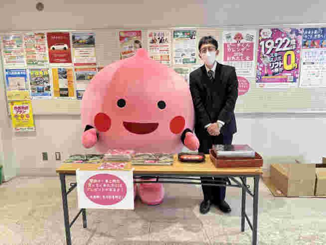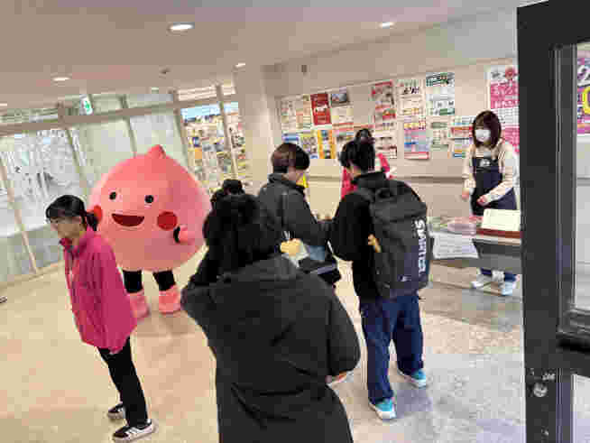 来場されたみなさんに、購入されたカレンダーをピーチくんがおわたしするこの企画は、去年に続けて2回目の実施。学生からも「カレンダーおわたし会、今年もいきます!」といううれしい声をいただき、ピーチくんも準備に余念がありませんでした🍑。