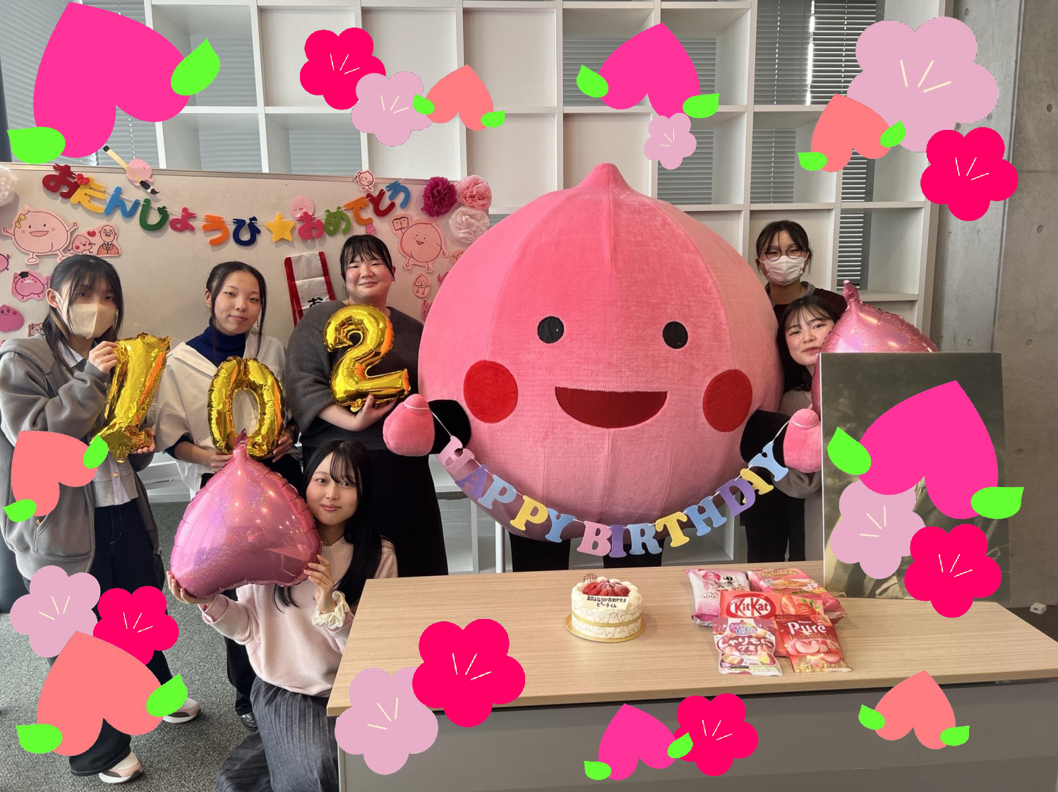 春休みのこの時期、学生のみなさんとふれあう機会が少なくどことなく寂しそうなピーチくんでしたが、このときばかりはうれしさに果肉を震わせ、学生のみなさんと濃密な時間をすごしたようです。ケーキもみんなでおいしくいただいたとのことでした!