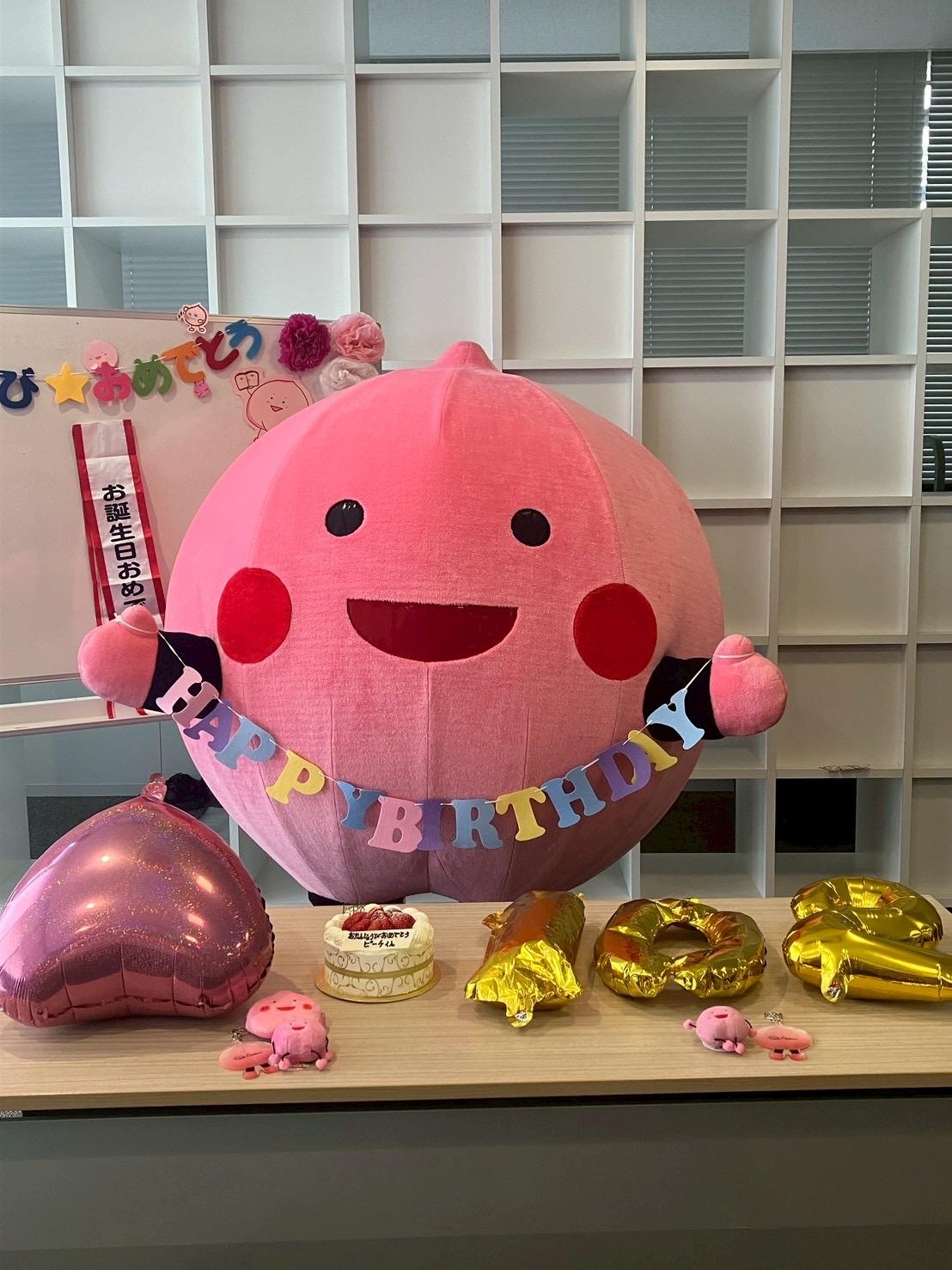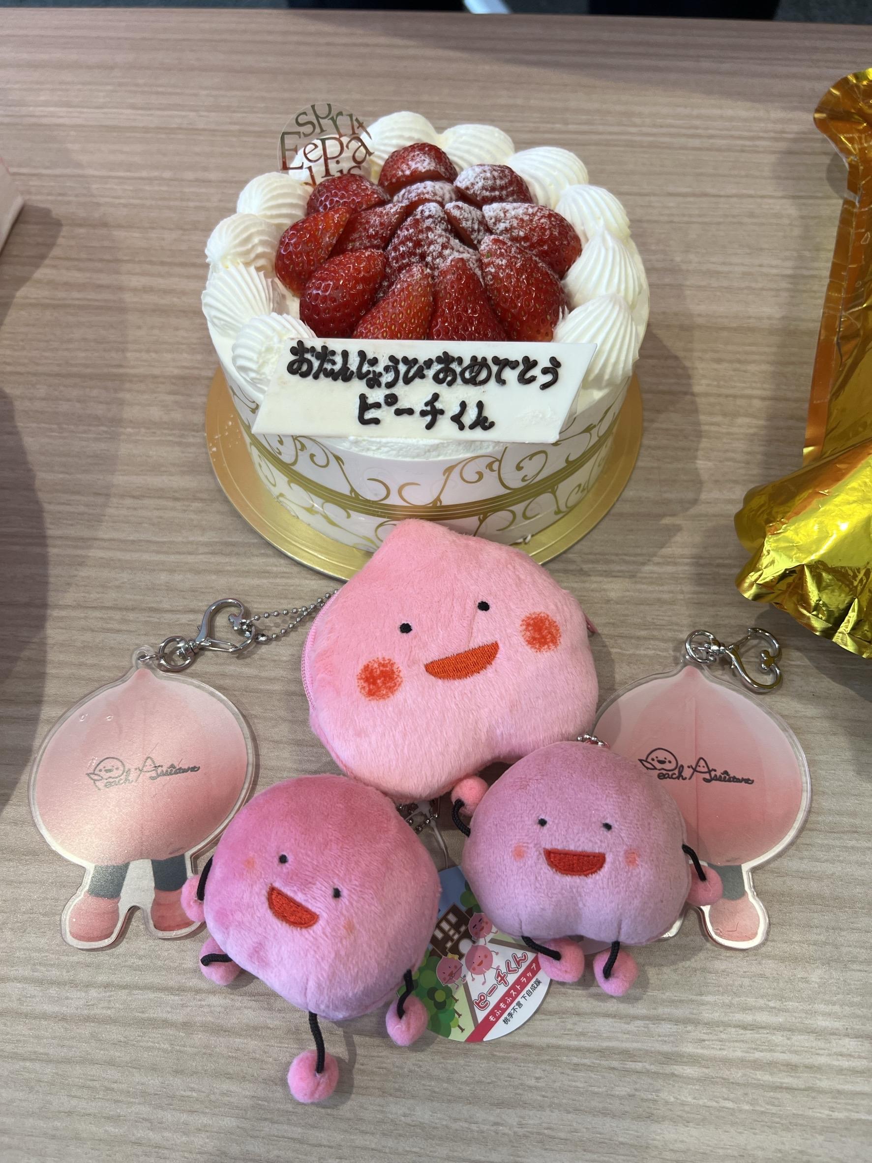 会場にはなんと「おたんじょうびおめでとう」のかわいらしい飾りと数々のピーチくんグッズ、風船、加えてお誕生日ケーキが…🎂!!