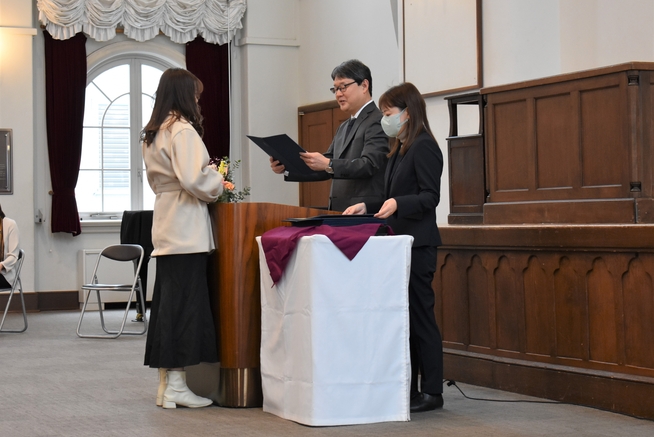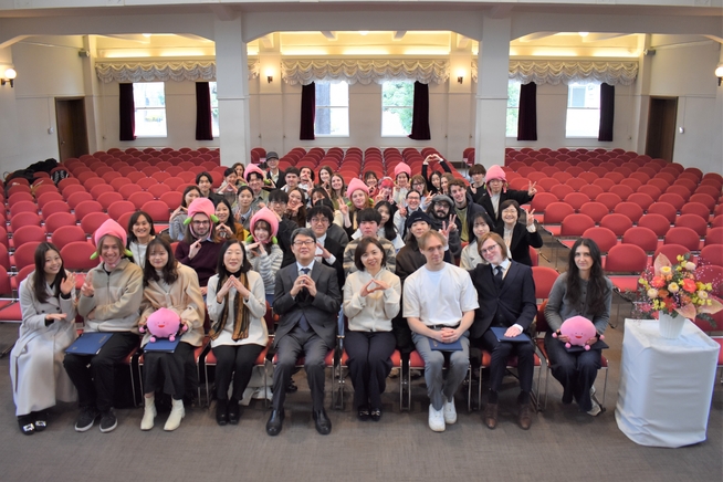 2026年1月21日(水)、本館大講堂にて2025年度後期協定留学生修了式が行われました。11大学、17名の留学生の修了を関係者約50名がお祝いしました。
