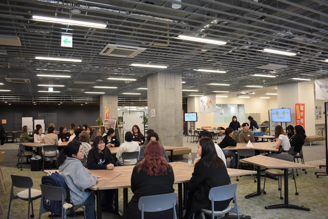 システムへのログイン手続きや書類の記入などを行い、ランチタイムの休憩時間には留学生をサポートする成蹊大学生を交えた交流会が11号館グローバルスクエアでありました。軽食を食べながらリラックスした雰囲気の中で自己紹介をし合い、あっという間に和気あいあいとした楽しい時間となりました。