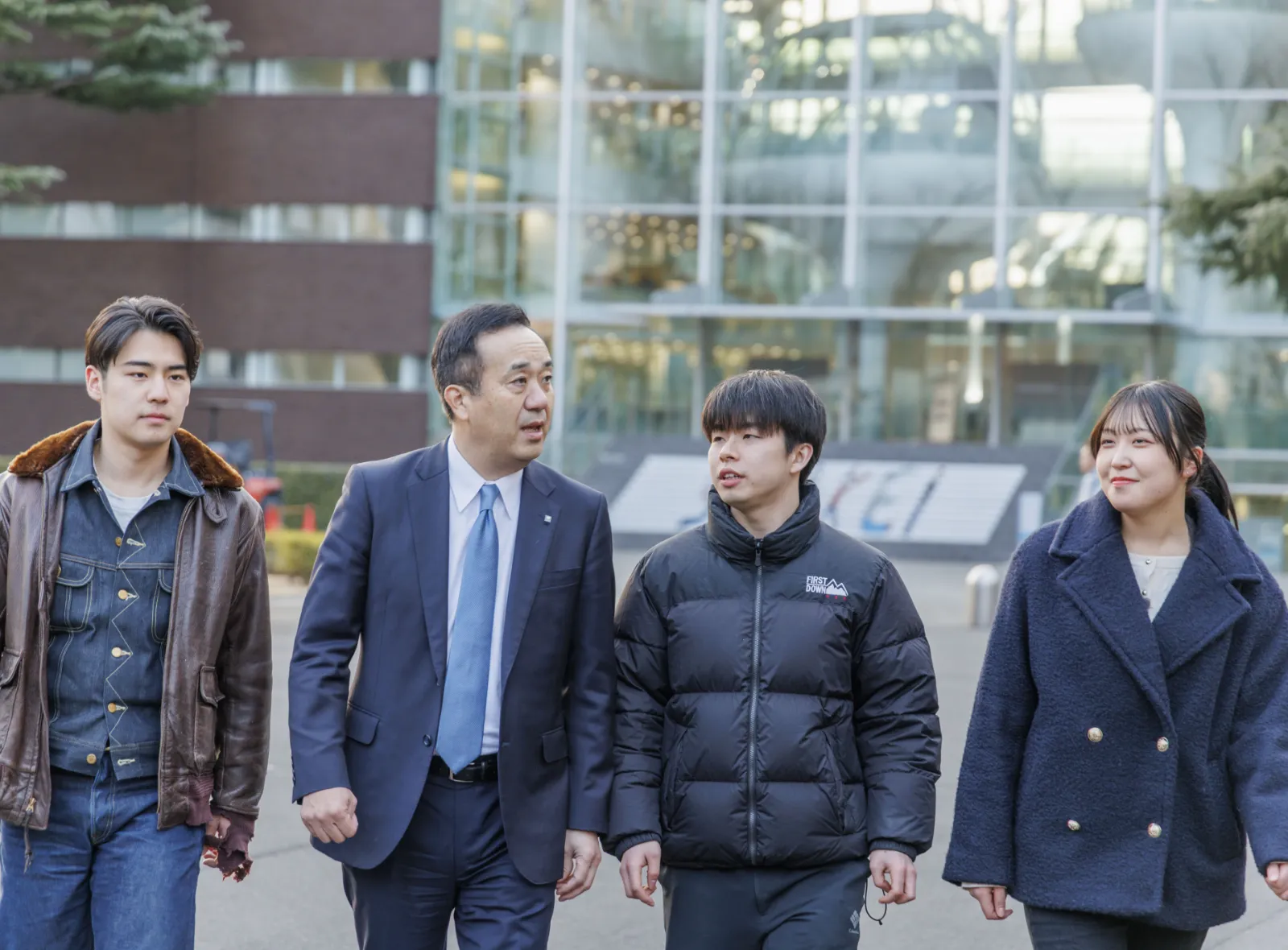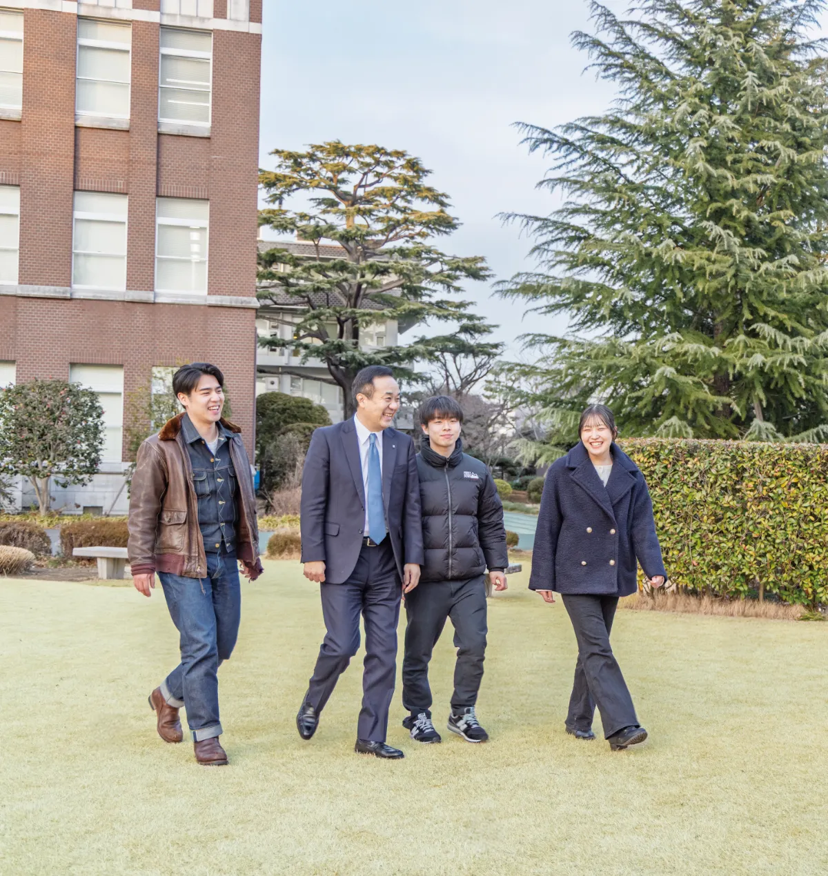 「久しぶりですが、本当に雰囲気が良いですよね」と校舎を見上げるのは、2024年に東京海上日動火災保険取締役社長に就任した城田宏明さん。今回の里帰りでは、剣道に打ち込んだ大学時代や、保険会社社長としての思いを語っていただきました。