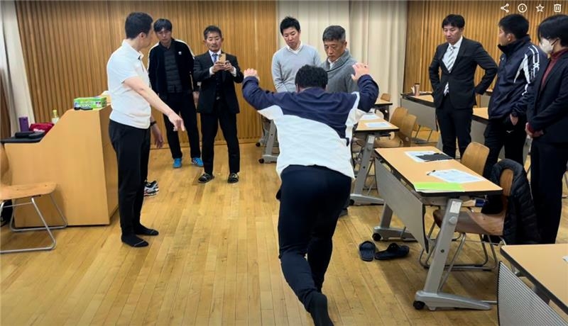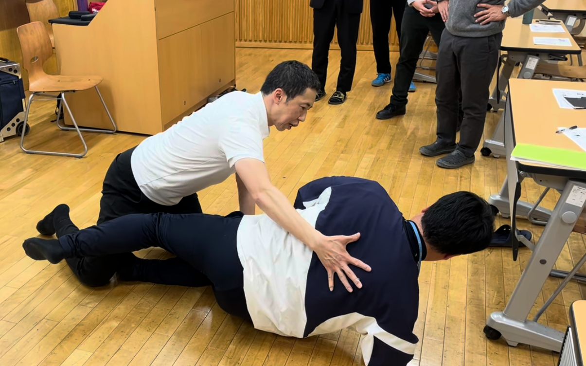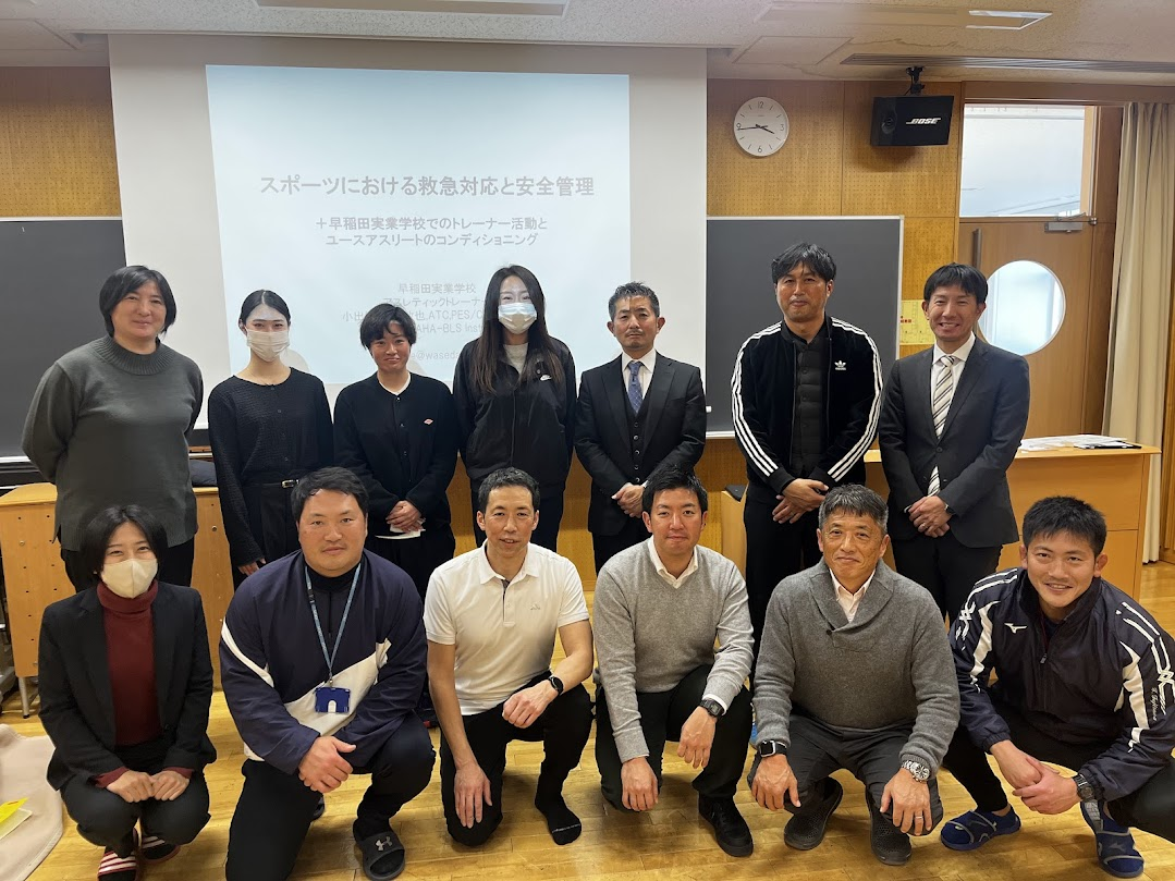 講習会では、スポーツ現場で想定されるさまざまな緊急事態への対応方法や、安全管理の重要性について、具体的な事例を交えながら分かりやすくご説明いただきました。また、現在所属されている早稲田実業学校でのトレーナー活動の実際や、ユースアスリートのコンディショニングについてもご教授いただき、日常の部活動指導に直結する内容となりました。さらに、実技を交えた講習では、教員一人ひとりが実際に体を動かしながら学ぶことができ、緊急時に迅速かつ適切に対応するための意識と技術を高める、大変有意義な研修の機会となりました。