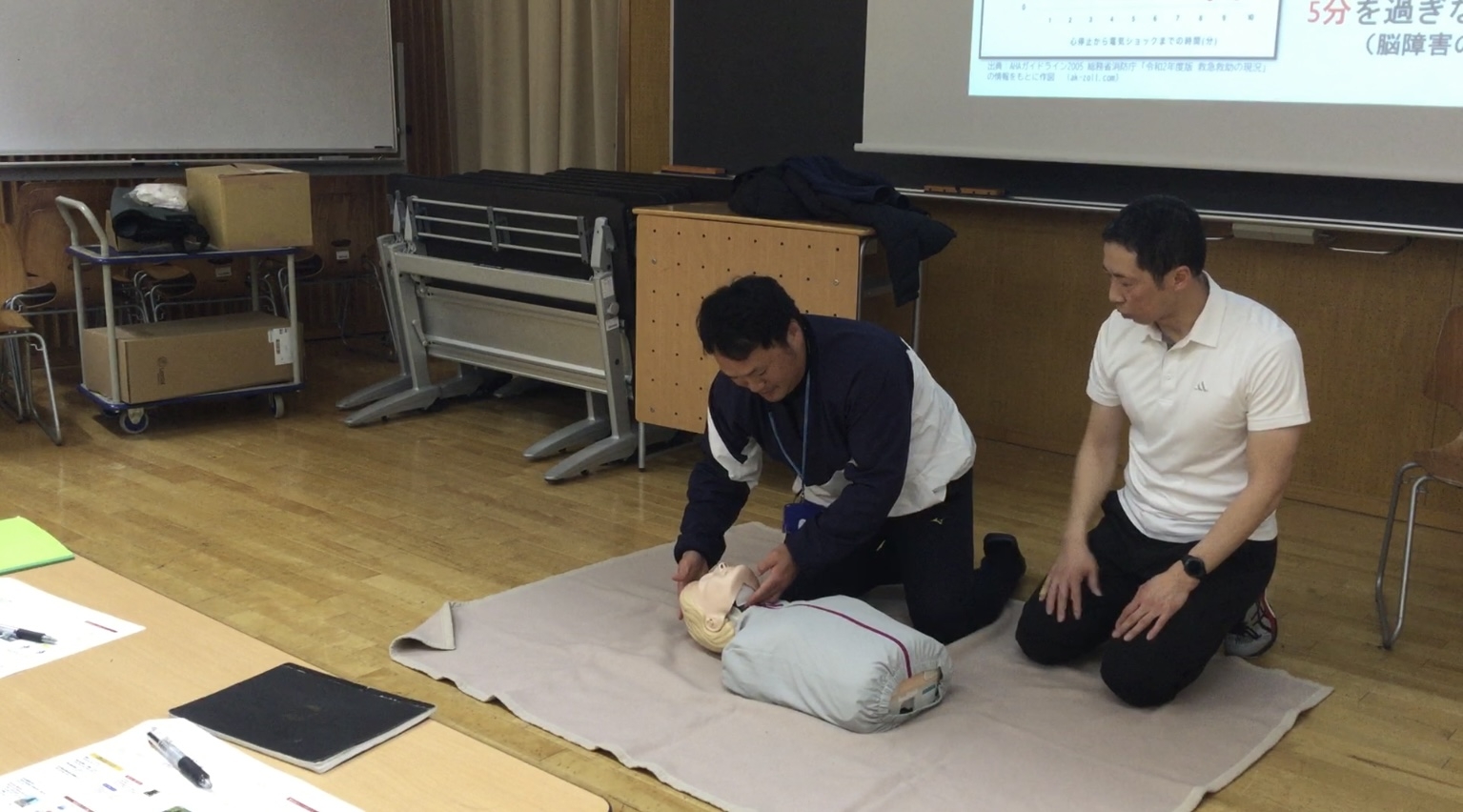 保健体育科では、体育授業および体育祭など 生徒が体育・スポーツ活動に取り組む際の安全管理および緊急時対応を教員間で知識と認識を共有することを目的に、毎年外部講師をお招きした「スポーツ救急法講習会」を開催しております。