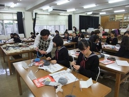 中学家庭部では「『伝統のニット』著者と作るネックウォーマー」と題して、ニット講座を開催しました。講師には、NPO法人ライフニットを立ち上げた横山起也さん、ニットデザイナーの中村仁美さん、毛糸ブランド「パピー」の高尾絹恵さんの3名をお迎えし、好きな色と形のネックウォーマーを制作しました。合間に、3名の方々の現在のお仕事の内容、仕事のやりがい、そのお仕事についた経緯などを話していただいたり、貴重なヴィンテージニットに触れてみたり、貴重な体験となりました。完成したネックウォーマーは1月展で展示します。
