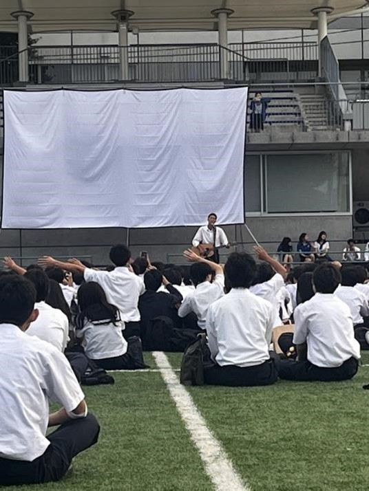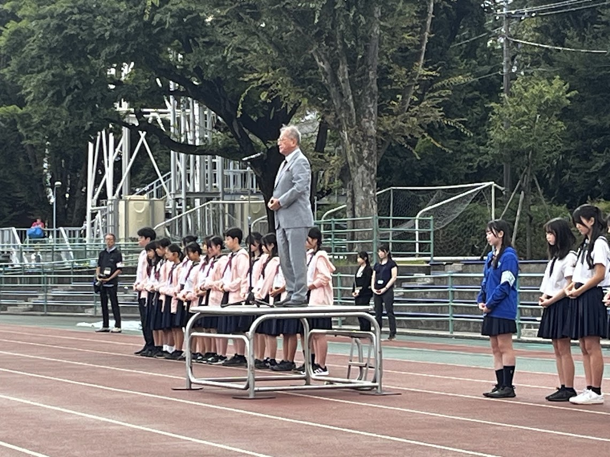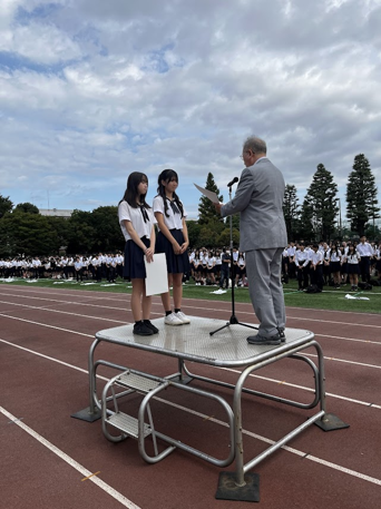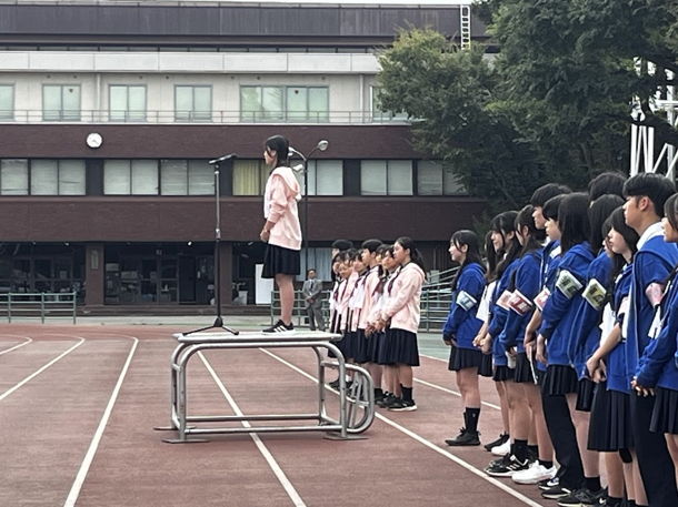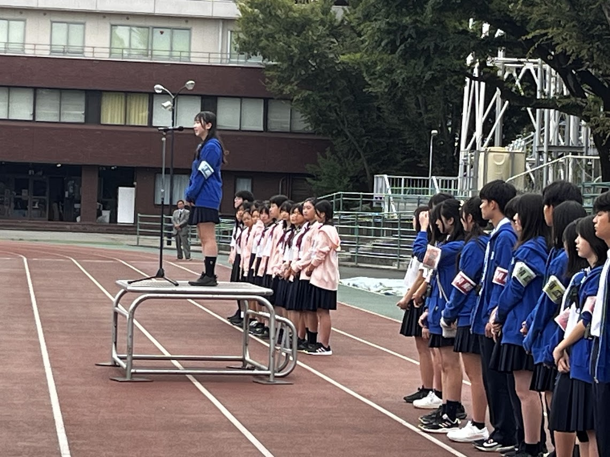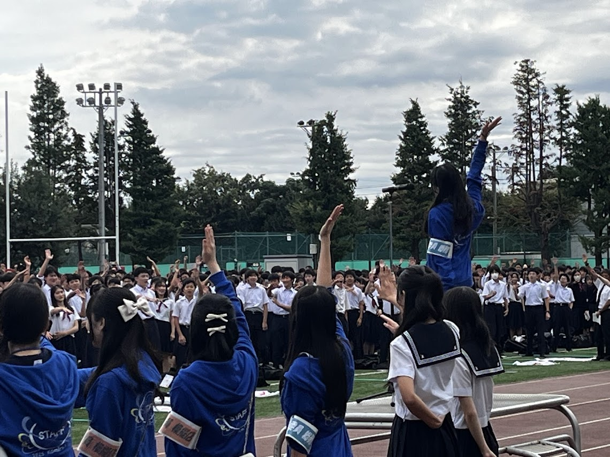 開会式では、校長先生のお話しのあと、中学実行委員長が、今年のスローガン「Sparkle」に込めた思いを語りました。「一人ひとりが自分らしく輝き、文化祭を楽しもう!」というメッセージに、生徒たちの熱い思いがこもっていました。高校実行委員長からも、「一生に一度の二日間を、みんな笑顔で素敵な思い出にしよう!」と力強いエールが送られ、全員で手を上げて心を一つにしました。