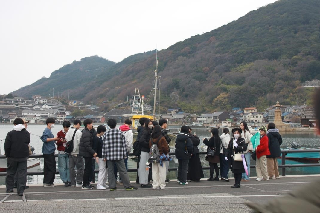 福山駅到着後、まず訪れたのは鞆の浦。ここは、ジブリ作品のポニョの舞台として知られる町です。伝統的な港町の様子がたくさん残っています。ランドマークである常夜燈前にてみんなで写真を撮りました。次は、竹原の街並みを散策しました。二つの重要伝統的建造物群保存地区をめぐった後は、忠海港から大久野島のホテルへと向かいました。