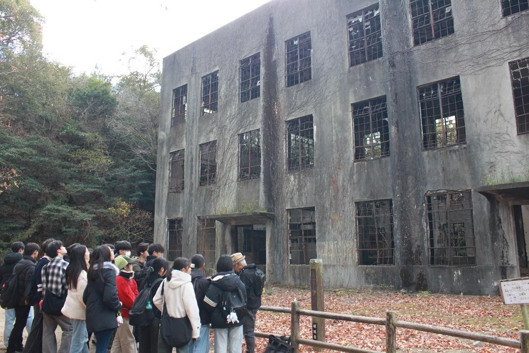 ホテルから大久野島のガイドの山内さんに講演、フィールドワークをしていただきました。この島は地図から消された島として有名です。その理由は、第二次世界大戦下で毒ガスを製造していたからでした。その歴史について知り、島内に残る戦争遺跡を巡りました。午後は、別名レモン島と呼ばれる生口島をサイクリングしました。生口島の1周25㎞を走破する人がいれば、観光地でレモンケーキを食べていた人もいました。