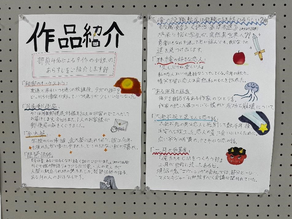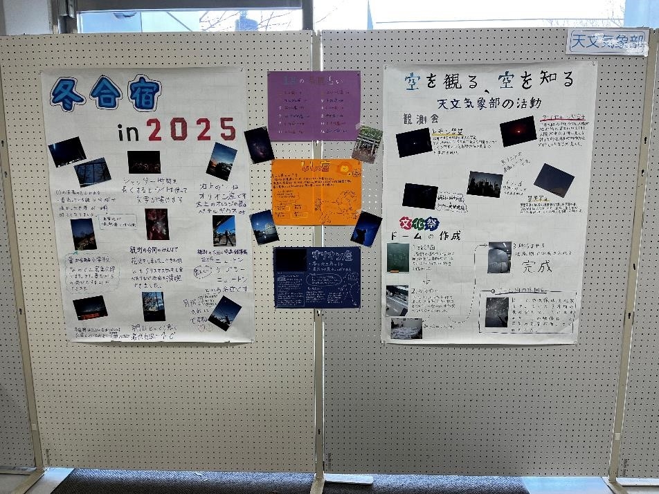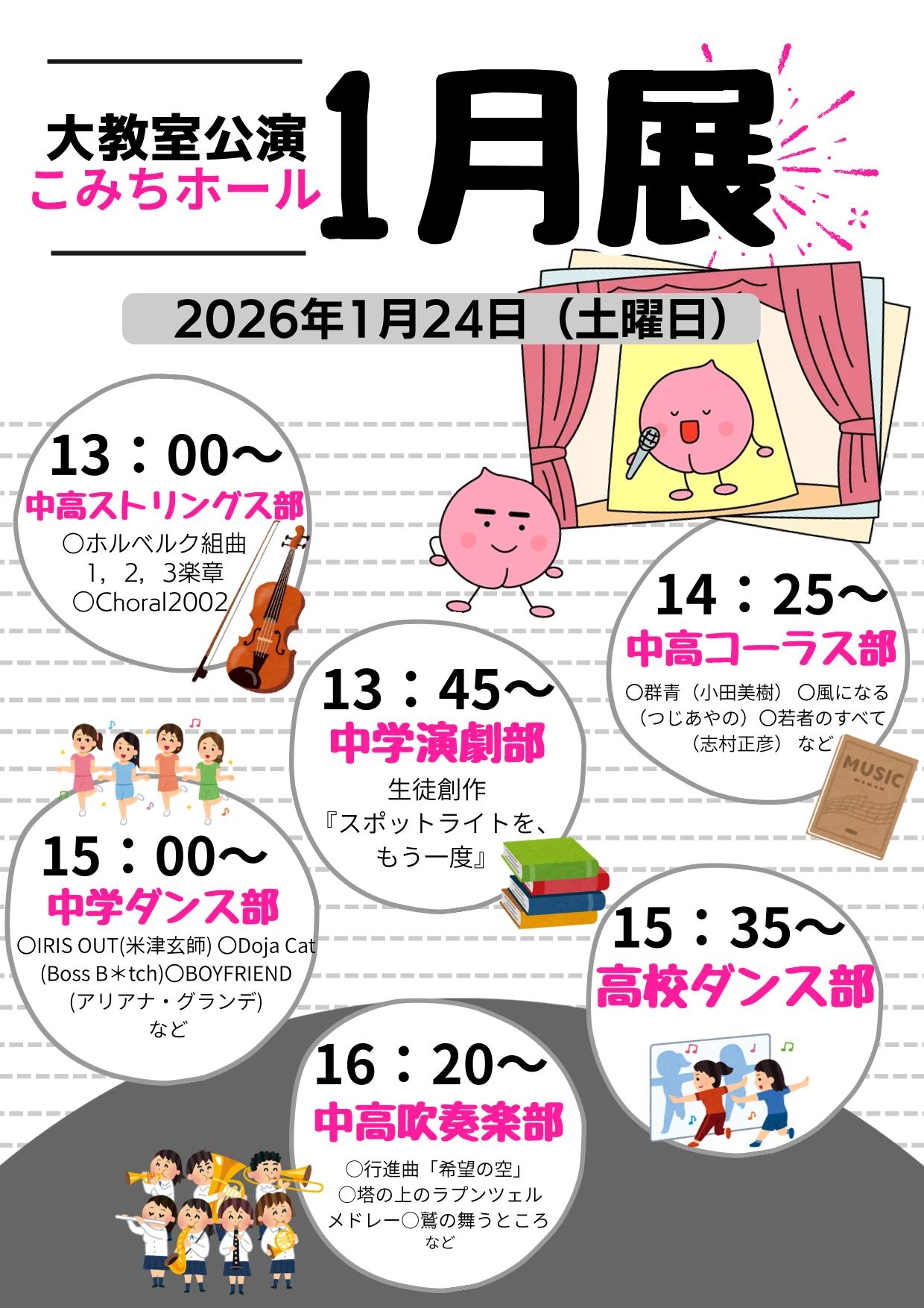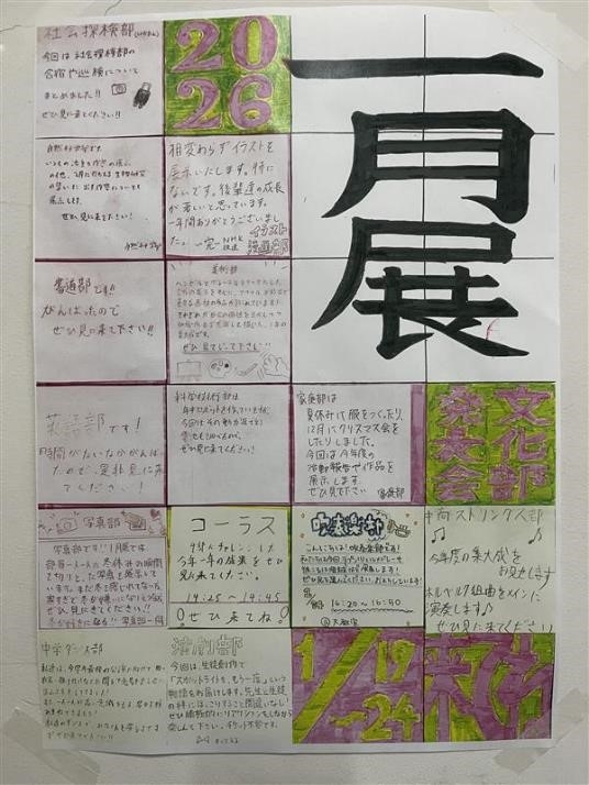 文化部の1月展が行われました。1月19日から24日まで展示を行い、24日にこみちホールで公演を行いました。展示団体は、中学:自然科学部、写真部、科学技術部、社会探検部、美術部、書道部、家庭部、イラスト漫画部、高校:生物部、写真部、天文気象部、書道部、美術部、文芸部でした。こみちホールで公演を行った団体は、吹奏楽部、ストリングス部、中学演劇部、コーラス部、中学ダンス部、高校ダンス部でした。日頃の練習の成果を発揮して、素晴らしい展示、発表となりました。