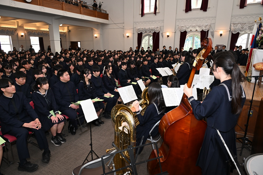 式の最後に、中高吹奏楽部によるお祝いの演奏も行われました。「ひまわりの約束」「威風堂々」などの心のこもった演奏に卒業生たちは胸を熱くしていました。