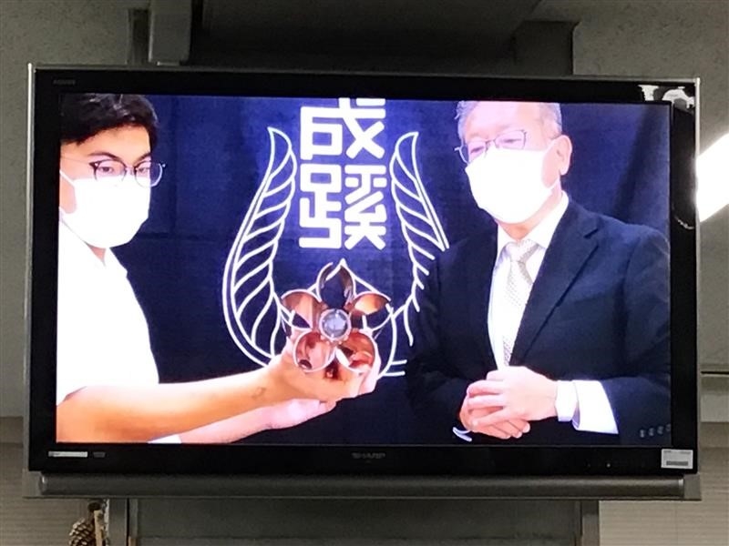 そして、始業式では、武蔵野市の聖火ランナーを務めた、本校を2002年に卒業した金子勇太様から貸していただいた「オリンピックの聖火リレートーチ」を見せることもできました。このトーチには、福島の仮設住宅で使われた廃材アルミが30%も使われているなどサスティナブルなうえ、新幹線を生んだ日本の最先端の技術を使ってとても軽くできています。聖火が燃え上がる先端は桜のマークになっており、日本の伝統も活かされています。また、トーチの正面の部分には突起があり、視覚障がい者でも分かるように配慮されているなど、人への優しさを感じました。