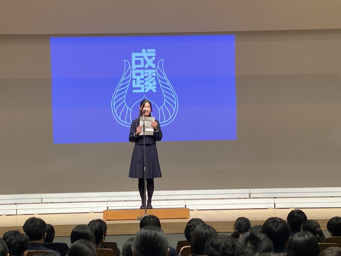 先ずは、初々しい1年生。最初に歌うクラスは、10名しかいな国際学級のH組でしたが、頑張って大役をこなしてくれました。その後も大きな会場に戸惑いながらも頑張って歌う姿が印象的でした。その結果、生徒が選んだ最優秀賞と実行委員が選んだ「歌自成蹊」賞はG組の「明日に渡れ」、教員が選んだ教員特別賞はF組の「明日へ」、そして私が選ぶ校長特別賞はB組の「時の旅人」でした。