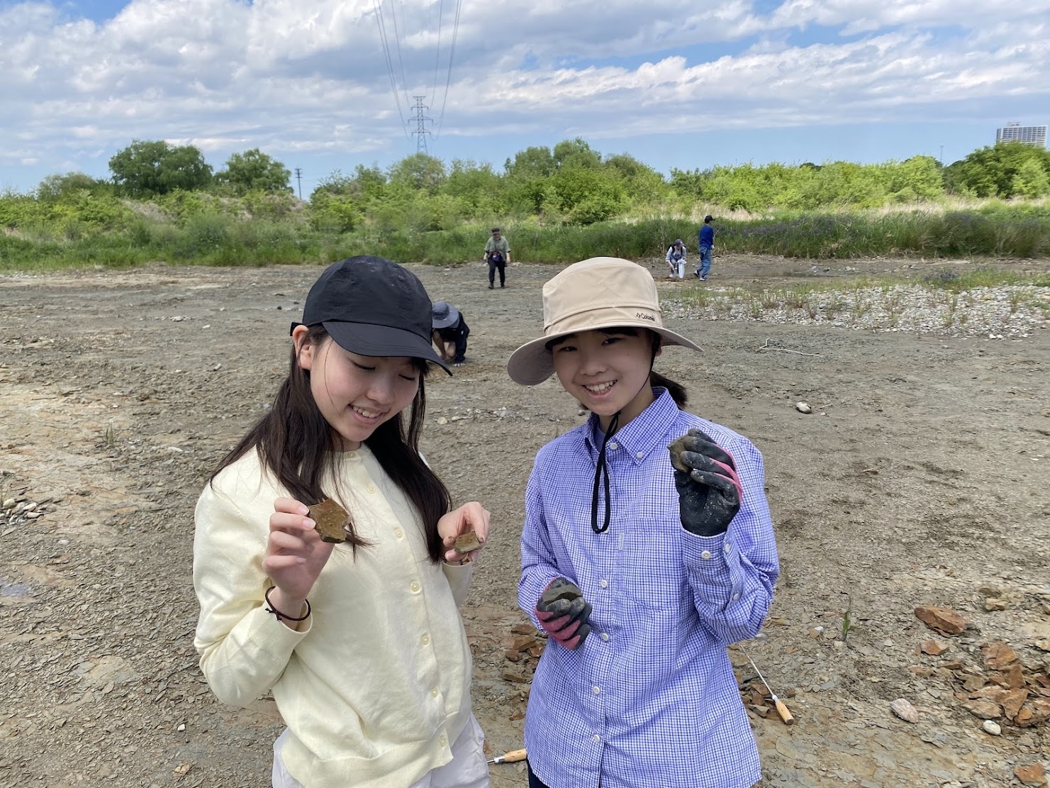 化石広場では、貸与されたドライバーを使って石を削っていきます。数分すると、めくれた石を見て、「あった!」「これそうかな」と言った声があちこちで聞かれてきました。地学の先生の所に急いで行き、化石だとわかるとみんな興奮します。あちらこちらで化石を真剣に掘る姿がとても印象的でした。残念ながら、私は化石を発見することができませんでした(そんなに簡単には見つけられません)。
