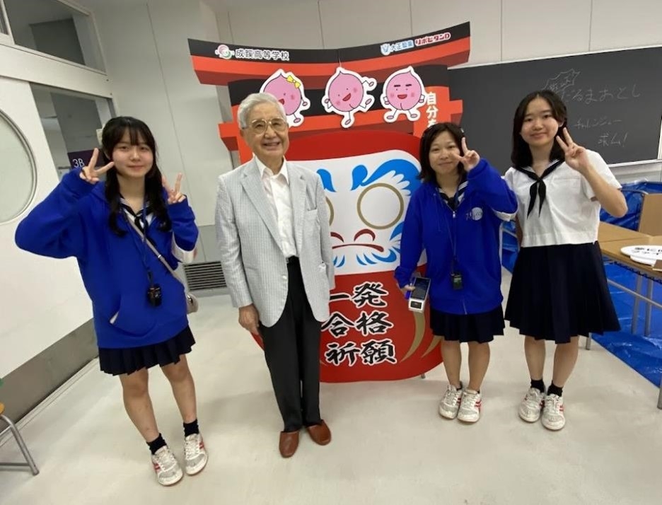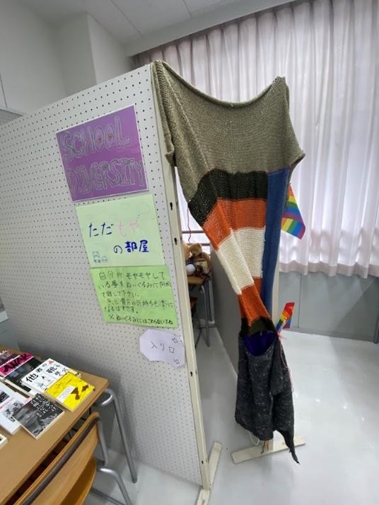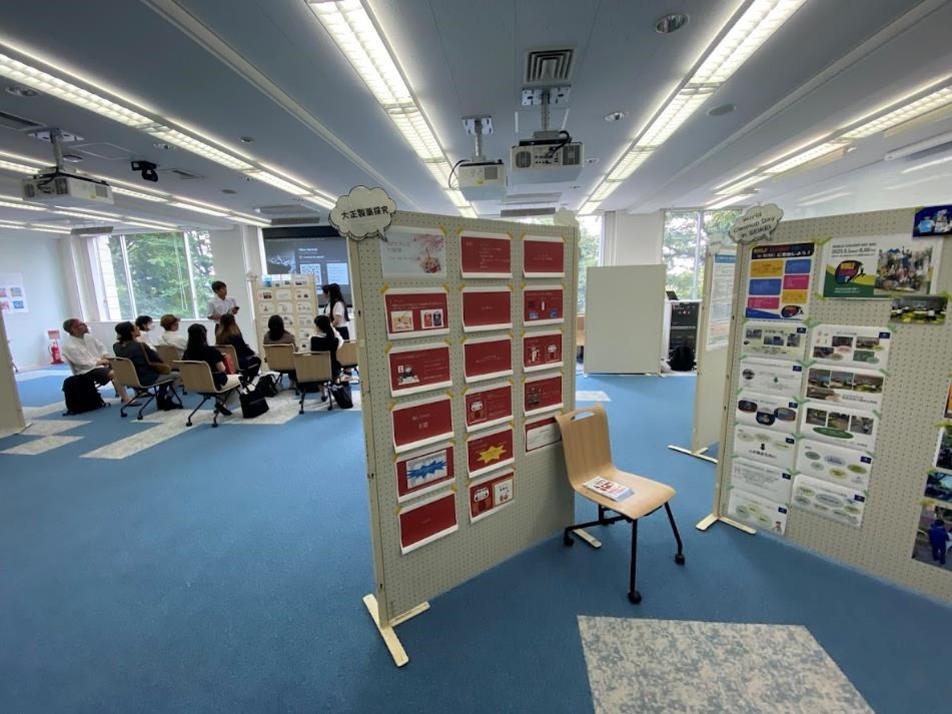 次の「スクールダイバーシティー」の部屋では、生徒が持ち寄った関連性のある幅広い分野の本が置かれており、その意識の高さに驚きました。モヤモヤしたことをつぶやける部屋まで用意されていて、面白かったです。近くにある「大正製薬✕探究学習」の部屋では、成蹊高校生がデザインしたリポビタンDボトルが販売されています。5年目となる今年のボトルデザインは、受験生向けというテーマから、合格祈願のダルマをモチーフにしたものでした。受験生の皆さんがこのダルマに目が入れられるように祈るばかりです。また、ピーチPRなどの生徒広報委員会や部屋一面を使った学校紹介ビデオなど、生徒の工夫があちらこちらに見られました。
