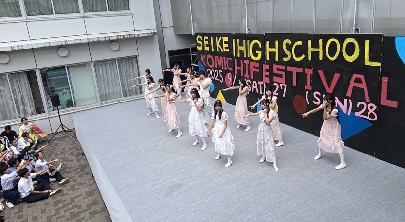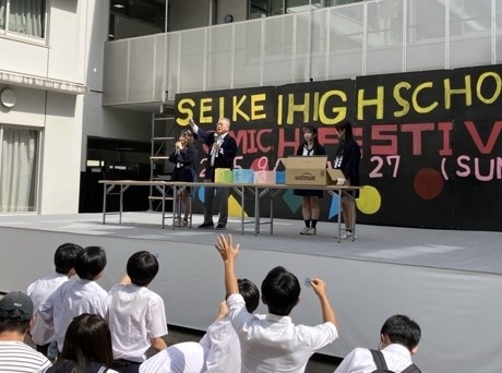 次に、中庭を使ったイベントステージは、いつも盛り上がっています。吹奏楽部やダンス部のパフォーマンスに加え、クラス劇やのど自慢まで多彩です。人気をいつも集めるのは「蹊坂46」で、アイドルさながらの応援が起こっていました。私は、「宝くじ」の抽選会において、両日とも一等賞を引く大役を任されました。在校生だけでなく、受験生や保護者からも当選者が出て、楽しい雰囲気で終わることができました。