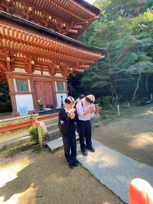 2日目の午前中は、白鳳期の薬師寺、天平期の唐招提寺、院政期の浄瑠璃寺と時代順に奈良を巡りました。特に、薬師寺では高次様に特別に金堂内で話をしていただき、仏教への理解も深まったと思います。午後は、奈良公園内にある興福寺と東大寺で、班ごとに自主行動での見学です。東大寺では、大仏殿、戒壇堂や三月堂といったチェックポイントだけでなく、正倉院まで足を延ばした意欲的な班もあったほか、鹿と戯れる姿も印象的でした。