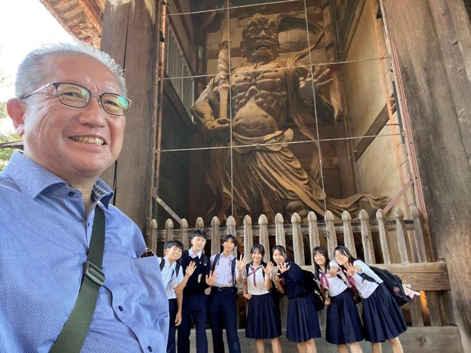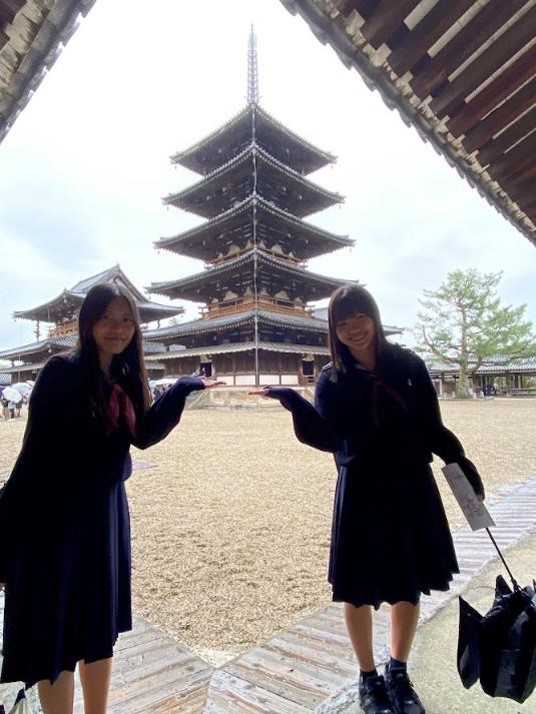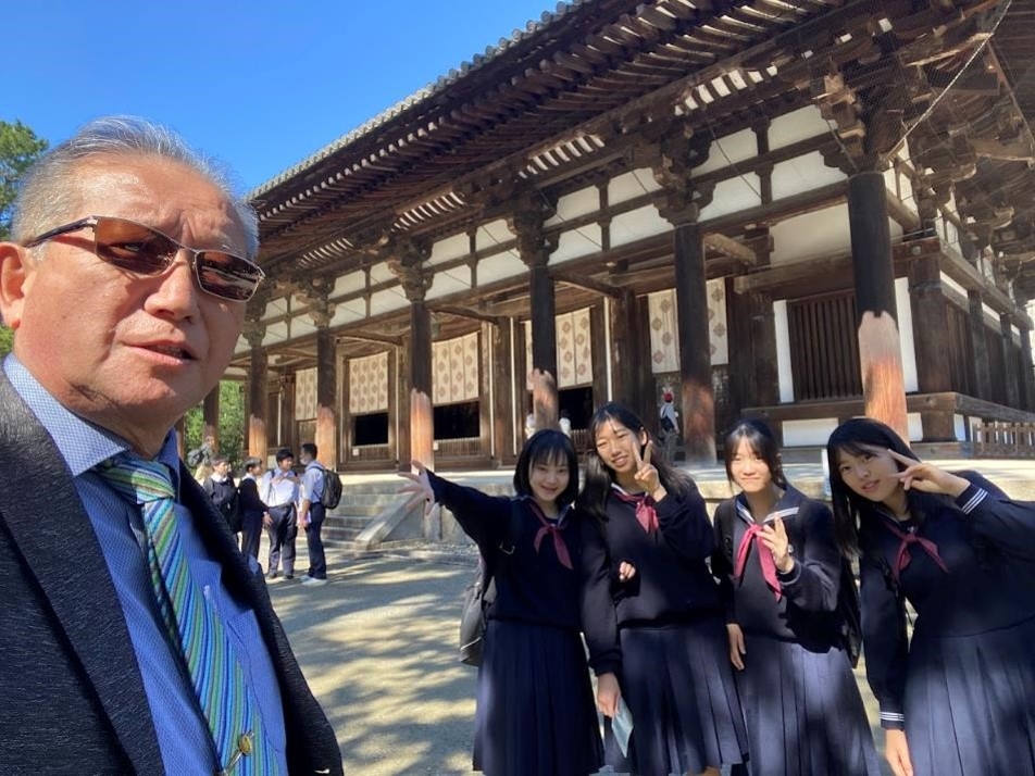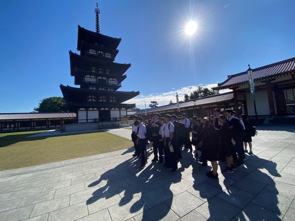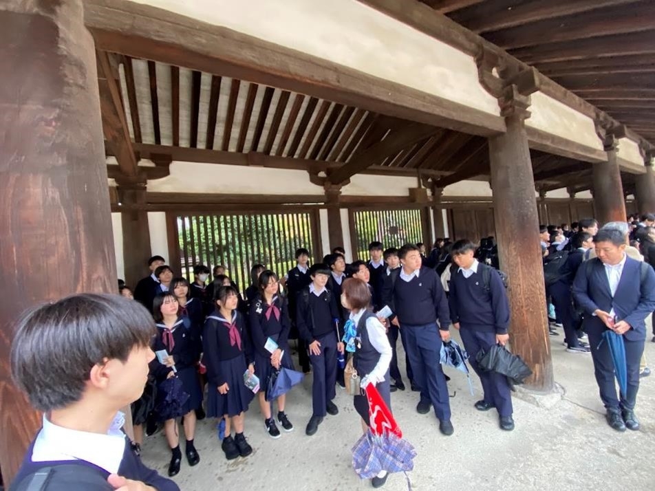 1日目は、朝8時過ぎに東京駅に集合し、新幹線で新大阪まで行きます。途中、ランチとして崎陽軒のシウマイ弁当を食べながら、修学旅行が始まりました。今日の午後は、法隆寺の見学です。あいにく、小雨が降っていましたが、集合写真も無事撮れ、金堂や五重塔も拝観することができました。生徒の中には、私が行った事前授業(10/20)を覚えている生徒もおり、「あの屋根とこの屋根の比が白銀比か」と言った声も聞こえ、ちょっと嬉しくなりました。宝物殿では、玉虫厨子において、玉虫の羽が残っている部分に私が懐中電灯で光を当て、みんなで飛鳥期の光に酔いしれました。そして、夢殿では救世観音像(特別公開中でした)、中宮寺では弥勒菩薩像を見学するなど、法隆寺を堪能しました。そして奈良のホテルに入り、夜には薬師寺の高次喜勝様からの法話を聴きました。薬師寺の話だけでなく、奈良仏教の特色を含め、生徒に意見を求めながら楽しいお話を聴くことができました。