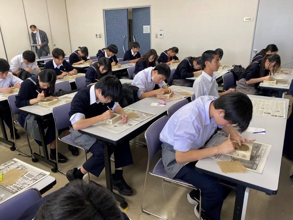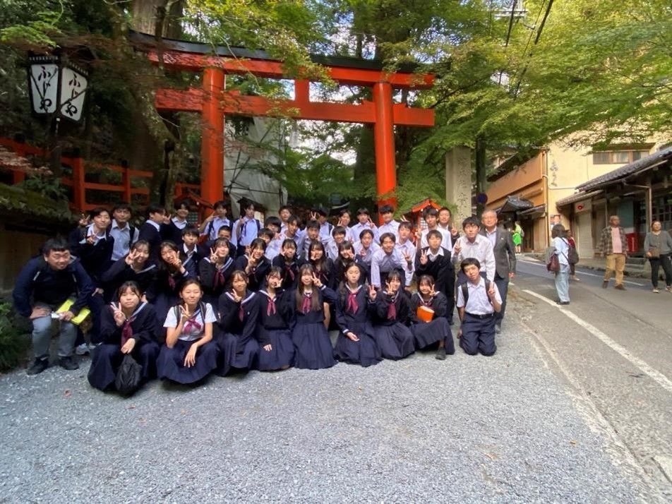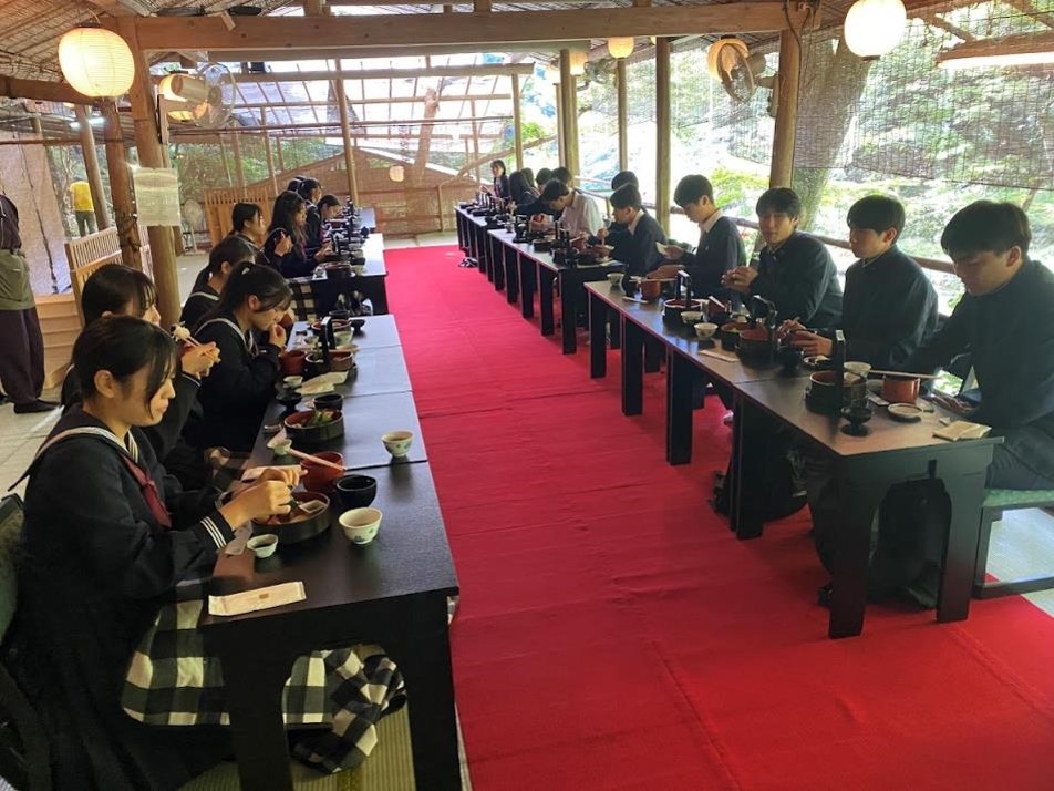 3日目は、奈良から京都にかけての移動日ですが、7つのテーマを決め、クラスを分解して、自分の興味関心のあるコースに参加する新しい取組です。それぞれのコースには、友禅染、抹茶作り、八つ橋作り、おばんざい作り、ミニ瓦作り、写経、座禅、京扇子絵付けといった体験を取り入れています。それ以外にも、比叡山延暦寺や貴船神社、将軍塚青龍殿など、なかなか個人では行けない場所も入れているほか、食事も自然美溢れる高雄のもみぢ家や萬福寺の普茶料理など、京料理も堪能することができました。