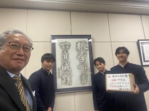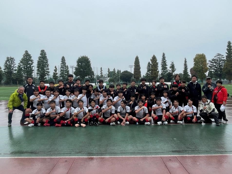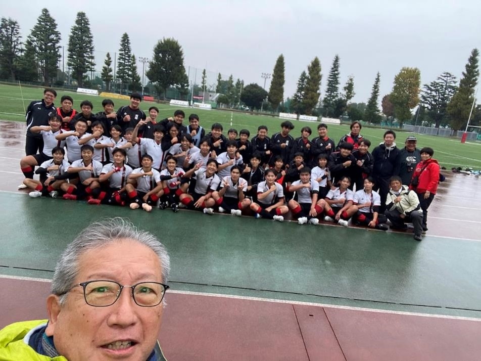 今日の試合では、最後まで手を抜くことなく全員で声を掛け合い、頑張る姿勢が印象的でした。特に、突破力やボールに集散する速さには、目を見張るものがありました。生徒にも声を掛けられたうえ、一緒に写真まで撮れて、素敵な一日となりました。私の差し入れも少し効果があったかもしれません。成蹊中学ラグビー部が東日本大会で1回戦を突破したのは22年ぶりの快挙です。次の試合は、11月24日(月)に、今度は神奈川県第1位の慶應義塾普通部ですが、この調子で良い結果が出ることを期待します。勝てば、23年ぶりの準決勝進出です。頑張れ、中学ラグビー部!!