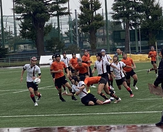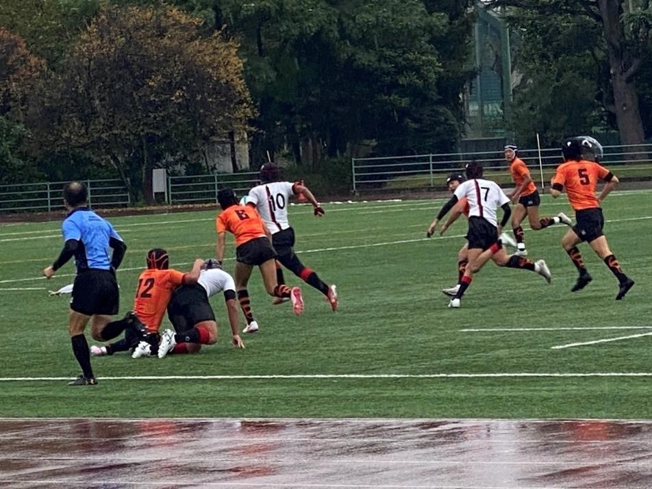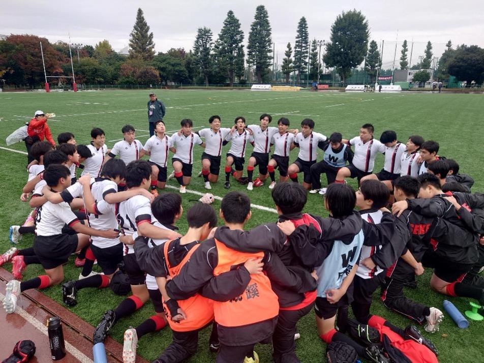 そして、11月9日(日)、成蹊学園けやきグランドにおいて、初戦の相手である埼玉県1位の熊谷市立富士見中学校と1回戦を戦いました。当日は、あいにくの雨空でしたが、保護者や生徒達など、非常に多くの方が応援に駆けつけてくれました。気合いの入った選手たちは、試合開始当初から優勢に敵陣に攻め込み、連続トライを挙げるなど、好調な出足です。その後も1トライを追加し、前半は19対0で終えました。後半は攻められる場面もありましたが、相手の攻撃をしのぐと、反撃に転じて3トライの猛攻です。最後は相手チームの逆襲に遭い、最終ラインまで押し込まれましたが、全員での防御は素晴らしく、零封で試合終了となりました。