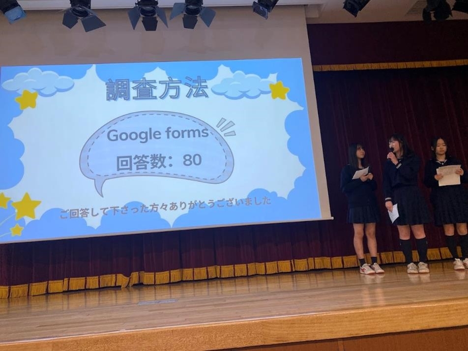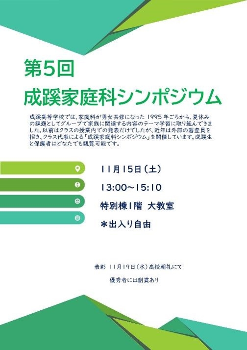 11月15日(土)、第5回家庭科シンポジウムが本校大教室で開催されました。今年で五回目を迎えるこのシンポジウムは、高校2年生の家庭科の授業で行った課題研究の中から選ばれたクラス代表によるプレゼン大会です。代表チームのテーマは、「子どもの成長を促すおもちゃの実現」「苦手なピーマンが未来を苦くする?!」「叱るvs褒める:子どもの成長に与える影響の違い」「兄弟構成で性格は違う?」「外そう!メディアの色眼鏡」「#映える私とリアルな私~SNSとアイデンティティのつながりを考える~」「男性の育休について」「母親の死をくいとめる」の8つで、興味の湧くテーマが揃いました。