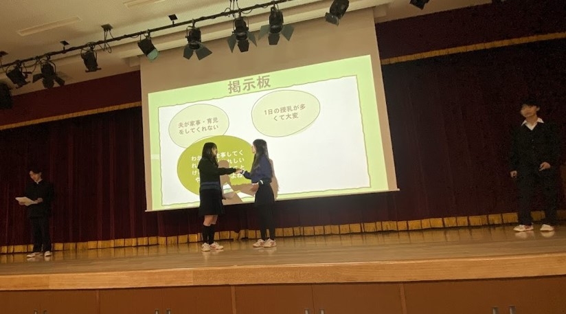 結果として優勝は、出産後の母親の「産後うつ」を取り上げた「母親の死をくいとめる」でした。準優勝は、食べ物の好き嫌いは悪いことではなく、その解決に新しい発想が必要とした「苦手なピーマンが未来を苦くする?!」、第3位は、育休取得には地域差があることを課題とした「男性の育休について」でした。また、審査員特別賞には、様々なメディアを見比べる必要性を説いた「外そう!メディアの色眼鏡」が選ばれました。そのうえ、「#映える私とリアルな私~SNSとアイデンティティのつながりを考える~」にも、別途特別賞を頂きました。